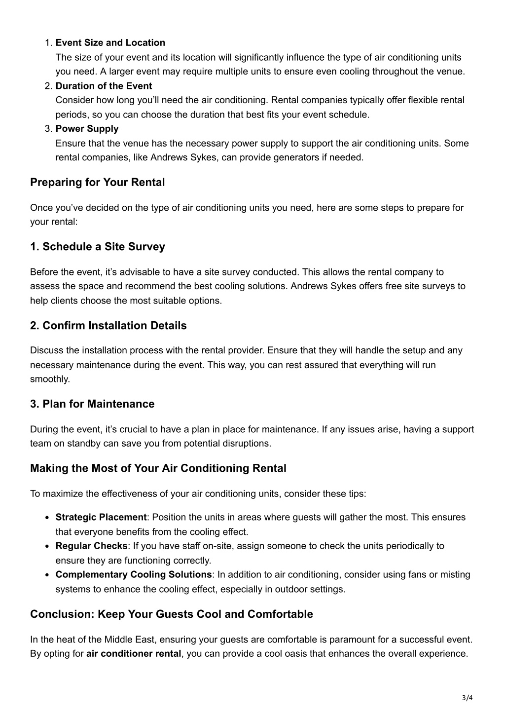 1. Event Size and Location The size of your event and its location will significantly influence the type of air conditioning units you need. A larger event may require multiple units to ensure even cooling throughout the venue. 2. Duration of the Event Consider how long you’ll need the air conditioning. Rental companies typically offer flexible rental periods, so you can choose the duration that best fits your event schedule. 3. Power Supply Ensure that the venue has the necessary power supply to support the air conditioning units. Some rental companies, like Andrews Sykes, can provide generators if needed. Preparing for Your Rental Once you’ve decided on the type of air conditioning units you need, here are some steps to prepare for your rental: 1. Schedule a Site Survey Before the event, it’s advisable to have a site survey conducted. This allows the rental company to assess the space and recommend the best cooling solutions. Andrews Sykes offers free site surveys to help clients choose the most suitable options. 2. Confirm Installation Details Discuss the installation process with the rental provider. Ensure that they will handle the setup and any necessary maintenance during the event. This way, you can rest assured that everything will run smoothly. 3. Plan for Maintenance During the event, it’s crucial to have a plan in place for maintenance. If any issues arise, having a support team on standby can save you from potential disruptions. Making the Most of Your Air Conditioning Rental To maximize the effectiveness of your air conditioning units, consider these tips: Strategic Placement: Position the units in areas where guests will gather the most. This ensures that everyone benefits from the cooling effect. Regular Checks: If you have staff on-site, assign someone to check the units periodically to ensure they are functioning correctly. Complementary Cooling Solutions: In addition to air conditioning, consider using fans or misting systems to enhance the cooling effect, especially in outdoor settings. Conclusion: Keep Your Guests Cool and Comfortable In the heat of the Middle East, ensuring your guests are comfortable is paramount for a successful event. By opting for air conditioner rental, you can provide a cool oasis that enhances the overall experience. 3/4