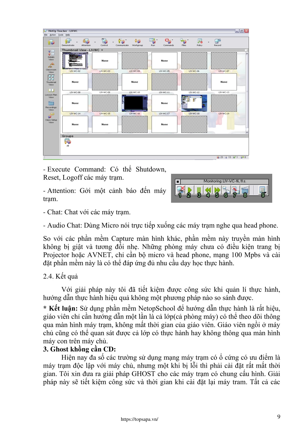 - Execute Command: Có thể Shutdown, Reset, Logoff các máy trạm. - Attention: Gởi một cảnh báo đến máy trạm. - Chat: Chat với các máy trạm. - Audio Chat: Dùng Micro nói trực tiếp xuống các máy trạm nghe qua head phone. So với các phần mềm Capture màn hình khác, phần mềm này truyền màn hình không bị giật và tương đối nhẹ. Những phòng máy chưa có điều kiện trang bị Projector hoặc AVNET, chỉ cần bộ micro và head phone, mạng 100 Mpbs và cài đặt phần mềm này là có thể đáp ứng đủ nhu cầu dạy học thực hành. 2.4. Kếtquả hướng dẫn thực hành hiệu quả không một phương pháp nào so sánh được. * Kết luận: Sử dụng phần mềm NetopSchool để hướng dẫn thực hành là rất hiệu, giáo viên chỉ cần hướng dẫn một lần là cả lớp(cả phòng máy) có thể theo dõi thông qua màn hình máy trạm, không mất thời gian của giáo viên. Giáo viên ngồi ở máy chủ cũng có thể quan sát được cả lớp có thực hành hay không thông qua màn hình máy con trên máy chủ. 3. Ghost khồngcần CD: Hiện nay đa số các trường sử dụng mạng máy trạm có ổ cứng có ưu điểm là máy trạm độc lập với máy chủ, nhưng một khi bị lỗi thì phải cài đặt rất mất thời gian. Tôi xin đưa ra giải pháp GHOST cho các máy trạm có chung cấu hình. Giải pháp này sẽ tiết kiệm công sức và thời gian khi cài đặt lại máy tram. Tất cả các Với giải pháp này tôi đã tiết kiệm được công sức khi quản lí thực hành, 9 https://topsapa.vn/