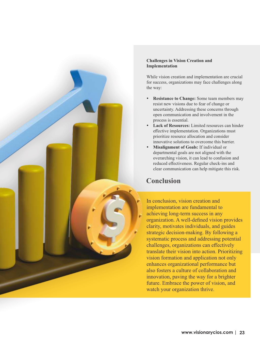 Challenges in Vision Creation and Implementation While vision creation and implementation are crucial for success, organizations may face challenges along the way: Resistance to Change: Some team members may resist new visions due to fear of change or uncertainty. Addressing these concerns through open communication and involvement in the process is essential. Lack of Resources: Limited resources can hinder effective implementation. Organizations must prioritize resource allocation and consider innovative solutions to overcome this barrier. Misalignment of Goals: If individual or departmental goals are not aligned with the overarching vision, it can lead to confusion and reduced effectiveness. Regular check-ins and clear communication can help mitigate this risk. Ÿ Ÿ Ÿ Conclusion In conclusion, vision creation and implementation are fundamental to achieving long-term success in any organization. A well-defined vision provides clarity, motivates individuals, and guides strategic decision-making. By following a systematic process and addressing potential challenges, organizations can effectively translate their vision into action. Prioritizing vision formation and application not only enhances organizational performance but also fosters a culture of collaboration and innovation, paving the way for a brighter future. Embrace the power of vision, and watch your organization thrive. www.visionarycios.com | 23