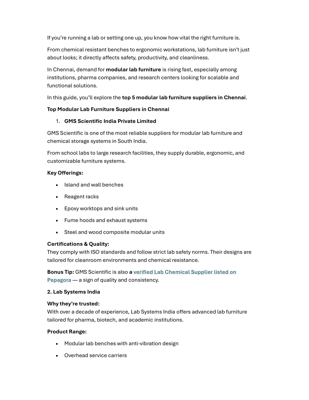 If you’re running a lab or setting one up, you know how vital the right furniture is. From chemical resistant benches to ergonomic workstations, lab furniture isn’t just about looks; it directly a?ects safety, productivity, and cleanliness. In Chennai, demand for modular lab furniture is rising fast, especially among institutions, pharma companies, and research centers looking for scalable and functional solutions. In this guide, you’ll explore the top 5 modular lab furniture suppliers in Chennai. Top Modular Lab Furniture Suppliers in Chennai 1.GMS Scientific India Private Limited GMS Scientific is one of the most reliable suppliers for modular lab furniture and chemical storage systems in South India. From school labs to large research facilities, they supply durable, ergonomic, and customizable furniture systems. Key O?erings: Island and wall benches Reagent racks Epoxy worktops and sink units Fume hoods and exhaust systems Steel and wood composite modular units Certifications & Quality: They comply with ISO standards and follow strict lab safety norms. Their designs are tailored for cleanroom environments and chemical resistance. Bonus Tip: GMS Scientific is also a verified Lab Chemical Supplier listed on Pepagora — a sign of quality and consistency. 2. Lab Systems India Why they’re trusted: With over a decade of experience, Lab Systems India o?ers advanced lab furniture tailored for pharma, biotech, and academic institutions. Product Range: Modular lab benches with anti-vibration design Overhead service carriers