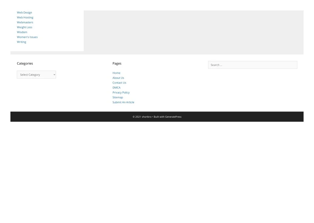 Web Design Web Hosting Webmasters Weight Loss Wisdom Women's Issues Writing Categories Pages Search … Home About Us Contact Us DMCA Privacy Policy Sitemap Submit An Article Select Category © 2021 shortkro • Built with GeneratePress