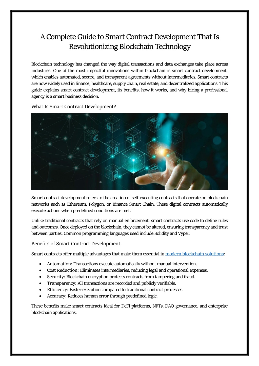 1. A Complete Guide to Smart Contract Development That Is Revolutionizing Blockchain Technology Blockchain technology has changed the way digital transactions and data exchanges take place across industries. One of the most impactful innovations within blockchain is smart contract development, which enables automated, secure, and transparent agreements without intermediaries. Smart contracts are now widely used in finance, healthcare, supply chain, real estate, and decentralized applications. This guide explains smart contract development, its benefits, how it works, and why hiring a professional agency is a smart business decision. What Is Smart Contract Development? Smart contract development refers to the creation of self-executing contracts that operate on blockchain networks such as Ethereum, Polygon, or Binance Smart Chain. These digital contracts automatically execute actions when predefined conditions are met. Unlike traditional contracts that rely on manual enforcement, smart contracts use code to define rules and outcomes. Once deployed on the blockchain, they cannot be altered, ensuring transparency and trust between parties. Common programming languages used include Solidity and Vyper. Benefits of Smart Contract Development Smart contracts offer multiple advantages that make them essential in modern blockchain solutions: •Automation: Transactions execute automatically without manual intervention. •Cost Reduction: Eliminates intermediaries, reducing legal and operational expenses. •Security: Blockchain encryption protects contracts from tampering and fraud. •Transparency: All transactions are recorded and publicly verifiable. •Efficiency: Faster execution compared to traditional contract processes. •Accuracy: Reduces human error through predefined logic. These benefits make smart contracts ideal for DeFi platforms, NFTs, DAO governance, and enterprise blockchain applications.