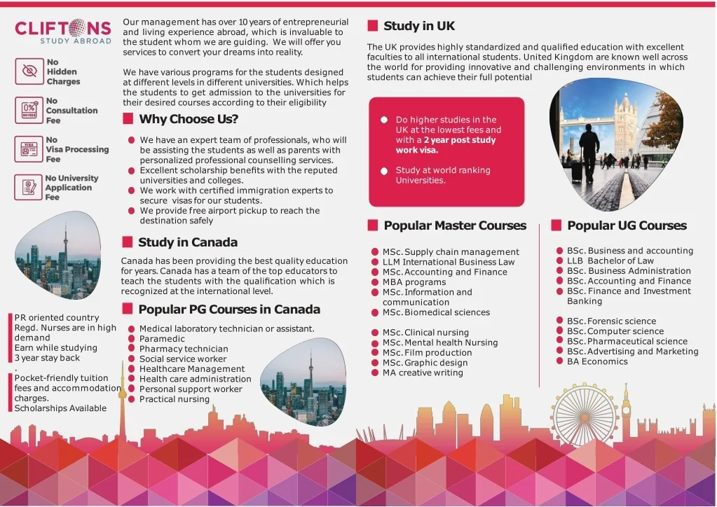 Ourmanagementhasover10yearsofentrepreneurial and living experience abroad, which is invaluable to thestudentwhomweareguiding.Wewillofferyou servicestoconvertyourdreamsintoreality. StudyinUK TheUKprovideshighlystandardizedandqualifiededucationwithexcellent facultiestoallinternationalstudents.UnitedKingdomareknownwellacross the world for providing innovative and challenging environments in which studentscanachievetheirfullpotential Wehavevariousprogramsforthestudentsdesigned atdifferentlevelsindifferentuniversities.Whichhelps the students to get admission to the universities for theirdesiredcoursesaccordingtotheireligibility WhyChooseUs? Wehaveanexpertteamofprofessionals,whowill beassistingthestudentsaswellasparentswith personalizedprofessionalcounsellingservices. Excellentscholarshipbenefitswiththereputed universitiesandcolleges. Weworkwithcertifiedimmigrationexpertsto securevisasforourstudents. Weprovidefreeairportpickuptoreachthe destinationsafely Dohigherstudiesinthe UKatthelowestfeesand witha2yearpoststudy workvisa. Studyatworldranking Universities. PopularMasterCourses PopularUGCourses BSc.Businessandaccounting LLBBachelorofLaw BSc.BusinessAdministration BSc.AccountingandFinance BSc.FinanceandInvestment Banking StudyinCanada Canadahasbeenprovidingthebestqualityeducation foryears.Canadahasateamofthetopeducatorsto teach the students with the qualification which is recognizedattheinternationallevel. MSc.Supplychainmanagement LLMInternationalBusinessLaw MSc.AccountingandFinance MBAprograms MSc.Informationand communication MSc.Biomedicalsciences PopularPGCoursesinCanada Medicallaboratorytechnicianorassistant. Paramedic Pharmacytechnician Socialserviceworker HealthcareManagement Healthcareadministration Personalsupportworker Practicalnursing PRorientedcountry Regd.Nursesareinhigh demand Earnwhilestudying 3yearstayback . Pocket-friendlytuition feesandaccommodation charges. ScholarshipsAvailable BSc.Forensicscience BSc.Computerscience BSc.Pharmaceuticalscience BSc.AdvertisingandMarketing BAEconomics MSc.Clinicalnursing MSc.MentalhealthNursing MSc.Filmproduction MSc.Graphicdesign MAcreativewriting