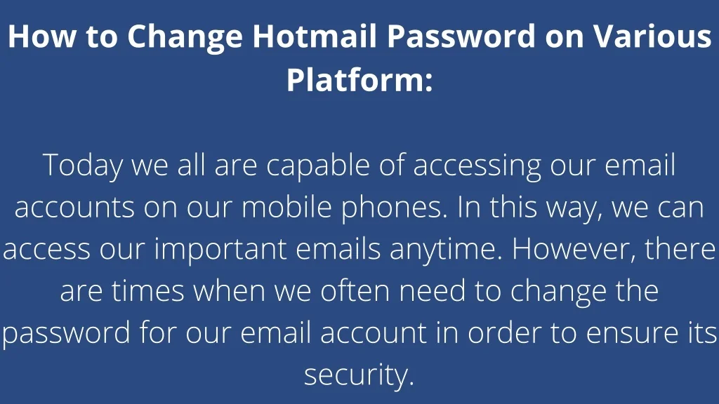 How to Change Hotmail Password on iPhone: When you change Hotmail password on iPhone, you have to make sure that you have also changed it into all of your other Apple devices. Here is how you can change the password for your Hotmail account on your iPhone device. Launch your mobile browser in your iPhone Navigate to the sign-in page of Hotmail or Outlook Enter the username and current password of your account Click on the sign-in button and then scroll to the Settings gear