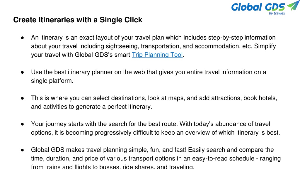 Global GDS offers well planned perfect trip management tool with all the services. We provide a one-stop solution to build your Online Travel Agency. Offer your visitors, reviews of destinations, find the best-rated hotels there; search & book hotels at the minimum costs and get the best flight prices. Help your customers to get their smallest travel problem answered online. Make searching for the best holiday package itinerary as easy as possible. For more details, pls visit our website: https://www.trawex.com/travel-itinerary.php<br>