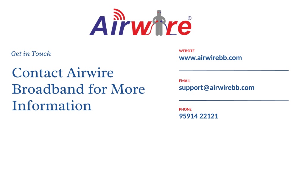 Get in Touch WEBSITE www.airwirebb.com Contact Airwire Broadband for More Information EMAIL support@airwirebb.com PHONE 95914 22121