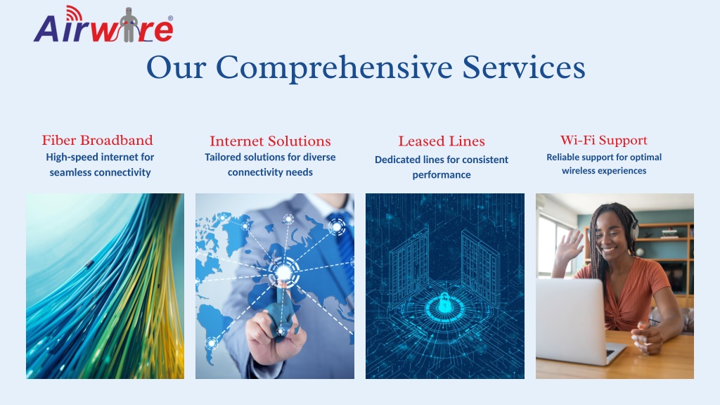 About Airwire Broadband Delivering Trustworthy High-Speed Internet Solutions for Everyone Airwire Broadband is dedicated to provide fast, secure, and reliable internet connectivity for both residential and business customers. Our commitment to quality and customer satisfaction ensures that you can always count on us for your online needs, enabling seamless browsing, streaming, and working from home.