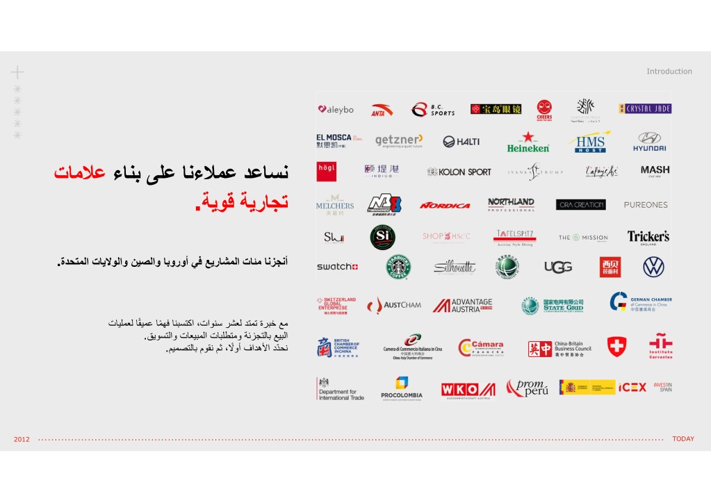 Introduction تامﻼع ءانب ىلع انءﻼمع دعاسن . ةيوق ةيراجت ةدحتملا تايﻻولاو نيصلاو ابوروأ يف عيراشملا تائم انزجنأ . معل اًقيمع اًمهف انبستكا ،تاونس رشعل دتمت ةربخ عم تايل قيوستلاو تاعيبملا تابلطتمو ةئزجتلاب عيبلا . ميمصتلاب موقن مث ،ًﻻوأ فادهﻷا دّدحن . TODAY 2012