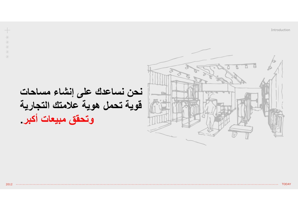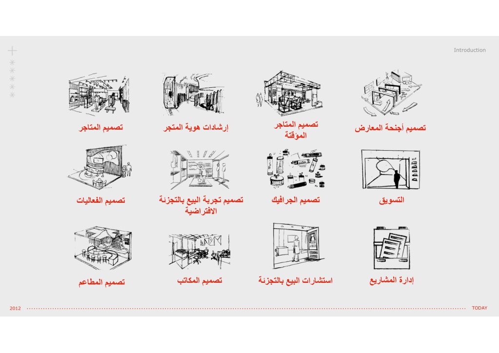 Introduction رجاتملا ميمصت ةتقؤملا رجاتملا ميمصت رجتملا ةيوه تاداشرإ ضراعملا ةحنجأ ميمصت كيفارجلا ميمصت قيوستلا ةئزجتلاب عيبلا ةبرجت ميمصت ةيضارتفﻻا تايلاعفلا ميمصت عيراشملا ةرادإ بتاكملا ميمصت ةئزجتلاب عيبلا تاراشتسا معاطملا ميمصت TODAY 2012
