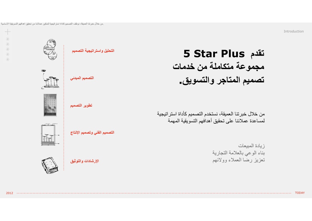 ةيساسﻷا ةيقيوستلا مهفادهأ قيقحت نم انئﻼمع نيكمتل ةيجيتارتسا ةادأك ميمصتلا فّظون ،ةقيمعلا انتربخ لﻼخ نم. Introduction 5 Star Plus مدقت تامدخ نم ةلماكتم ةعومجم قيوستلاو رجاتملا ميمصت . م يمصتلا ةيجيتارتساو ليلحتلا يئدبملا ميمصتلا ميمصتلا ريوطت تارتسا ةادأك ميمصتلا مدختسن ،ةقيمعلا انتربخ لﻼخ نم ةيجي ةمهملا ةيقيوستلا مهفادهأ قيقحت ىلع انئﻼمع ةدعاسمل جاتنﻹا ميمصتو ينفلا ميمصتلا تاعيبملا ةدايز ةيراجتلا ةمﻼعلاب يعولا ءانب مهئﻻوو ءﻼمعلا اضر زيزعت قيثوتلاو تاداشرﻹا TODAY 2012