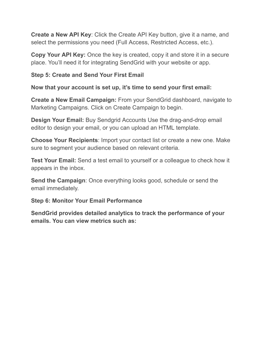 ● Scalable Solution: Whether you’re a small startup or an established business, SendGrid can scale with your needs. ● Comprehensive Analytics: Track email performance with detailed analytics, including open rates, click-through rates, and bounce rates. ● Ease of Integration: SendGrid integrates seamlessly with most eCommerce, CRM, and marketing platforms. How to Set Up a SendGrid Account Now, let’s walk through the steps to set up a SendGrid account and start using it for your email campaigns. Step 1: Sign Up for a SendGrid Account The first step is to create an account on SendGrid: Visit the SendGrid Website: Buy Sendgrid Accounts Go to the official SendGrid website at www.sendgrid.com.