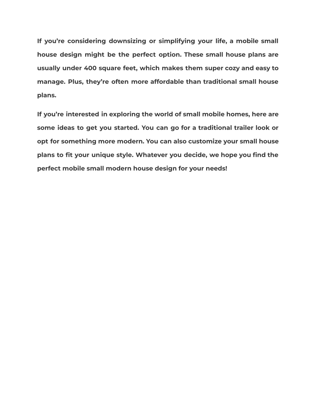 If you’re considering downsizing or simplifying your life, a mobile small house design might be the perfect option. These small house plans are usually under 400 square feet, which makes them super cozy and easy to manage. Plus, they’re often more affordable than traditional small house plans. If you’re interested in exploring the world of small mobile homes, here are some ideas to get you started. You can go for a traditional trailer look or opt for something more modern. You can also customize your small house plans to fit your unique style. Whatever you decide, we hope you find the perfect mobile small modern house design for your needs!