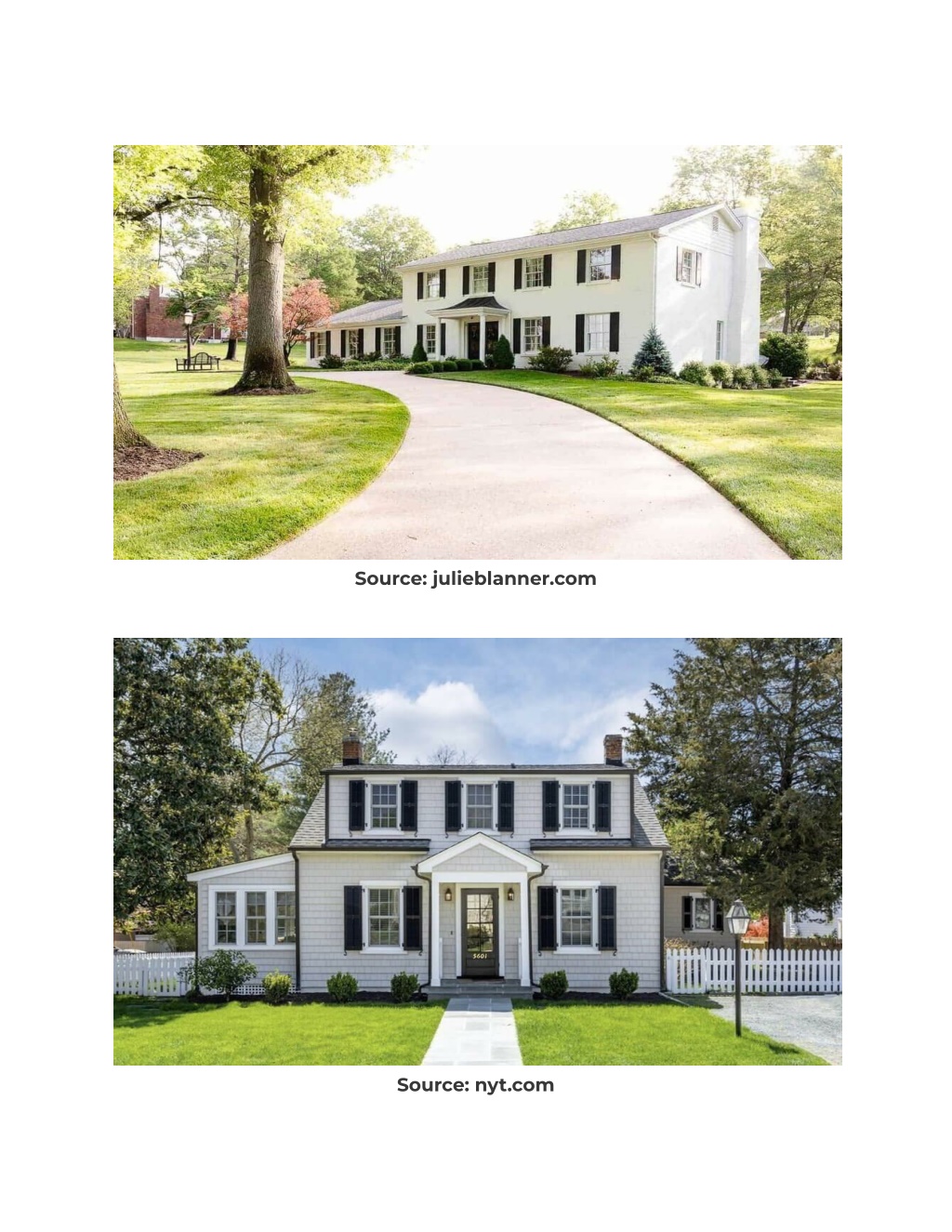 Brick houses always don’t have to be rustic. Try contemporary aesthetics like Old Hollywood style design for the facade. A path of grey brick pavers leads to a black and white Hollywood-style mansion with contemporary shutters, white board, and batten siding. Pool homes go well with this style. This painted brick house, for example, has an in-ground pool with black and white striped loungers and teak accent tables with umbrellas.