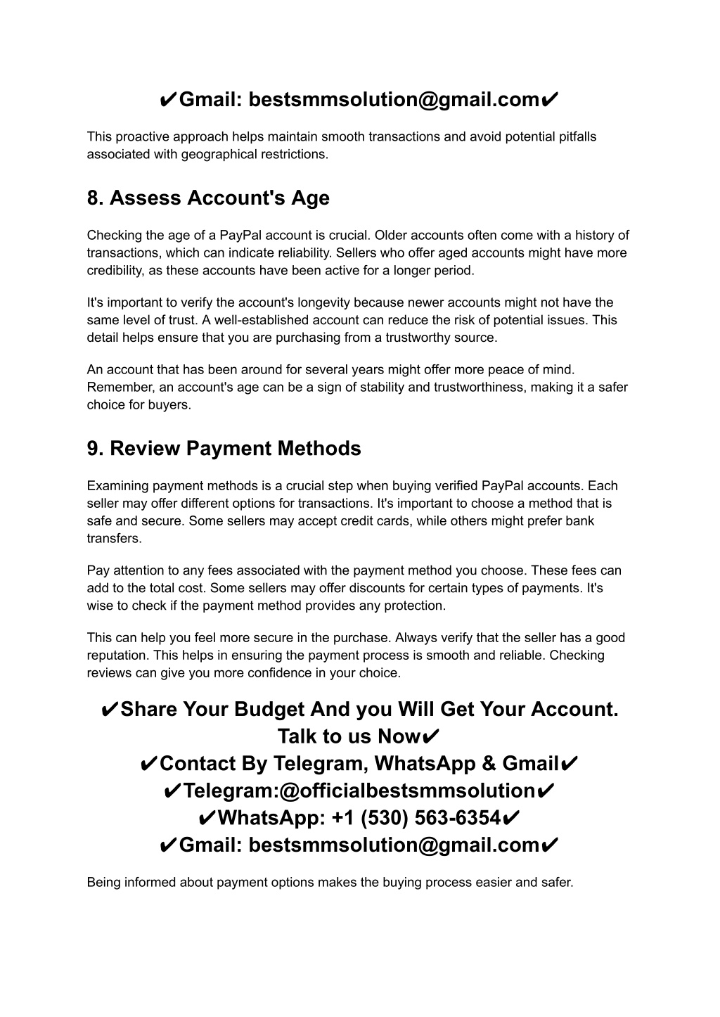 ✔Gmail: bestsmmsolution@gmail.com✔ This proactive approach helps maintain smooth transactions and avoid potential pitfalls associated with geographical restrictions. 8. Assess Account's Age Checking the age of a PayPal account is crucial. Older accounts often come with a history of transactions, which can indicate reliability. Sellers who offer aged accounts might have more credibility, as these accounts have been active for a longer period. It's important to verify the account's longevity because newer accounts might not have the same level of trust. A well-established account can reduce the risk of potential issues. This detail helps ensure that you are purchasing from a trustworthy source. An account that has been around for several years might offer more peace of mind. Remember, an account's age can be a sign of stability and trustworthiness, making it a safer choice for buyers. 9. Review Payment Methods Examining payment methods is a crucial step when buying verified PayPal accounts. Each seller may offer different options for transactions. It's important to choose a method that is safe and secure. Some sellers may accept credit cards, while others might prefer bank transfers. Pay attention to any fees associated with the payment method you choose. These fees can add to the total cost. Some sellers may offer discounts for certain types of payments. It's wise to check if the payment method provides any protection. This can help you feel more secure in the purchase. Always verify that the seller has a good reputation. This helps in ensuring the payment process is smooth and reliable. Checking reviews can give you more confidence in your choice. ✔Share Your Budget And you Will Get Your Account. Talk to us Now✔ ✔Contact By Telegram, WhatsApp & Gmail✔ ✔Telegram:@officialbestsmmsolution✔ ✔WhatsApp: +1 (530) 563-6354✔ ✔Gmail: bestsmmsolution@gmail.com✔ Being informed about payment options makes the buying process easier and safer.
