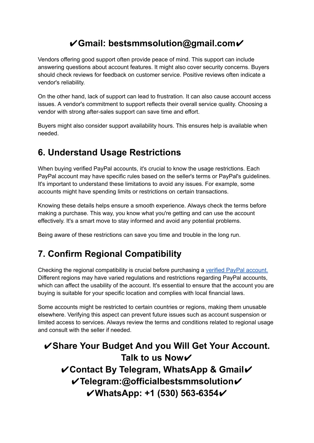 ✔Gmail: bestsmmsolution@gmail.com✔ Vendors offering good support often provide peace of mind. This support can include answering questions about account features. It might also cover security concerns. Buyers should check reviews for feedback on customer service. Positive reviews often indicate a vendor's reliability. On the other hand, lack of support can lead to frustration. It can also cause account access issues. A vendor's commitment to support reflects their overall service quality. Choosing a vendor with strong after-sales support can save time and effort. Buyers might also consider support availability hours. This ensures help is available when needed. 6. Understand Usage Restrictions When buying verified PayPal accounts, it's crucial to know the usage restrictions. Each PayPal account may have specific rules based on the seller's terms or PayPal's guidelines. It's important to understand these limitations to avoid any issues. For example, some accounts might have spending limits or restrictions on certain transactions. Knowing these details helps ensure a smooth experience. Always check the terms before making a purchase. This way, you know what you're getting and can use the account effectively. It's a smart move to stay informed and avoid any potential problems. Being aware of these restrictions can save you time and trouble in the long run. 7. Confirm Regional Compatibility Checking the regional compatibility is crucial before purchasing a verified PayPal account. Different regions may have varied regulations and restrictions regarding PayPal accounts, which can affect the usability of the account. It's essential to ensure that the account you are buying is suitable for your specific location and complies with local financial laws. Some accounts might be restricted to certain countries or regions, making them unusable elsewhere. Verifying this aspect can prevent future issues such as account suspension or limited access to services. Always review the terms and conditions related to regional usage and consult with the seller if needed. ✔Share Your Budget And you Will Get Your Account. Talk to us Now✔ ✔Contact By Telegram, WhatsApp & Gmail✔ ✔Telegram:@officialbestsmmsolution✔ ✔WhatsApp: +1 (530) 563-6354✔