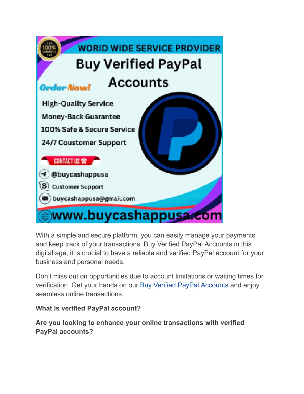 Buy Verified PayPal Accounts If you want to Buy Verified PayPal Accounts, you should do your research to find a reputable seller. There are many scams online, so you need to be careful. Once you find a seller you trust, purchase the account and follow the instructions to verify it. Buy Verified PayPal Accounts will give you more options and flexibility when using PayPal. We are working with the largest team and we are instant start work after your place order USA at cheap price from (Website) buycashappusa.com . So, Buy our Service and enjoy it. Why will you buy my service? 100% Customers Satisfaction Guaranteed. All Documents Fully Verified All Documents Provide With Accounts Very Cheap Price. High-Quality Service. 100% Money-Back Guarantee. 24/7 Ready to Customer Support.