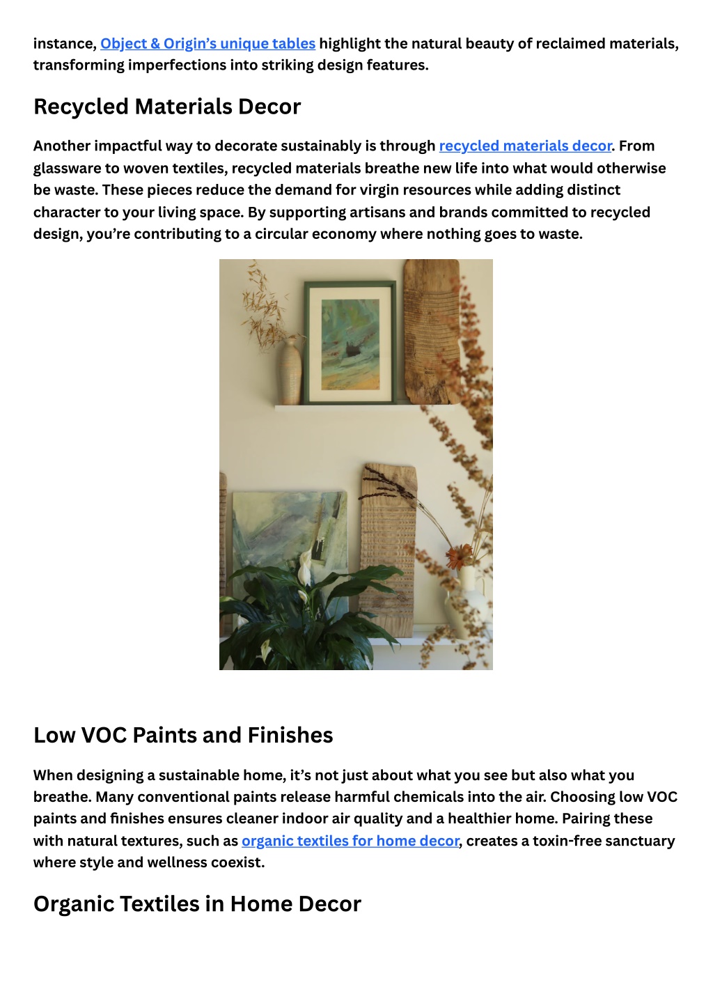 instance, Object & Origin’s unique tables highlight the natural beauty of reclaimed materials, transforming imperfections into striking design features. Recycled Materials Decor Another impactful way to decorate sustainably is through recycled materials decor. From glassware to woven textiles, recycled materials breathe new life into what would otherwise be waste. These pieces reduce the demand for virgin resources while adding distinct character to your living space. By supporting artisans and brands committed to recycled design, you’re contributing to a circular economy where nothing goes to waste. Low VOC Paints and Finishes When designing a sustainable home, it’s not just about what you see but also what you breathe. Many conventional paints release harmful chemicals into the air. Choosing low VOC paints and finishes ensures cleaner indoor air quality and a healthier home. Pairing these with natural textures, such as organic textiles for home decor, creates a toxin-free sanctuary where style and wellness coexist. Organic Textiles in Home Decor