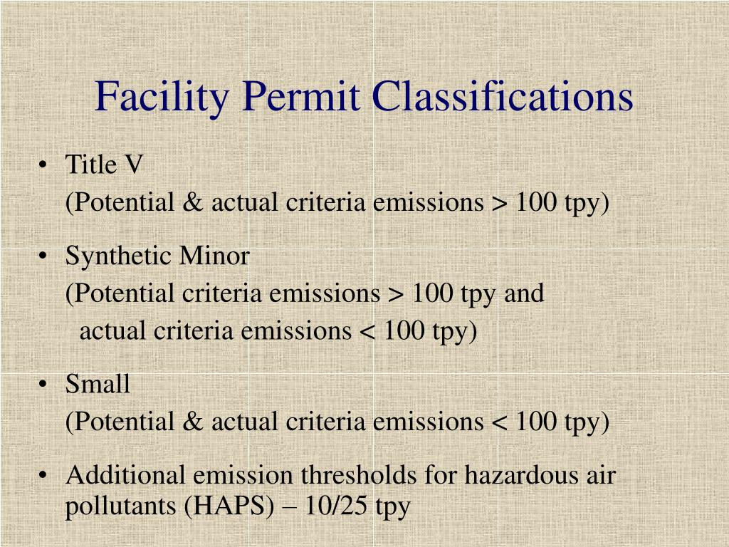 Facility Permit Classifications • Title V (Potential & actual criteria emissions > 100 tpy) • Synthetic Minor (Potential criteria emissions > 100 tpy and actual criteria emissions < 100 tpy) • Small (Potential & actual criteria emissions < 100 tpy) • Additional emission thresholds for hazardous air pollutants (HAPS) – 10/25 tpy