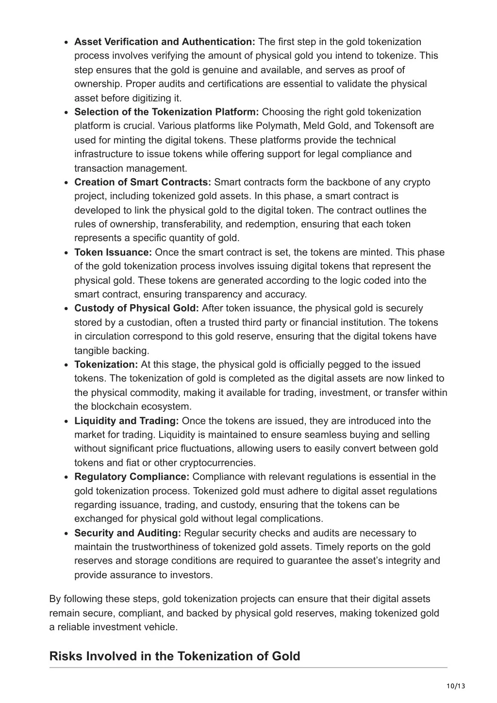 Asset Verification and Authentication: The first step in the gold tokenization process involves verifying the amount of physical gold you intend to tokenize. This step ensures that the gold is genuine and available, and serves as proof of ownership. Proper audits and certifications are essential to validate the physical asset before digitizing it. Selection of the Tokenization Platform: Choosing the right gold tokenization platform is crucial. Various platforms like Polymath, Meld Gold, and Tokensoft are used for minting the digital tokens. These platforms provide the technical infrastructure to issue tokens while offering support for legal compliance and transaction management. Creation of Smart Contracts: Smart contracts form the backbone of any crypto project, including tokenized gold assets. In this phase, a smart contract is developed to link the physical gold to the digital token. The contract outlines the rules of ownership, transferability, and redemption, ensuring that each token represents a specific quantity of gold. Token Issuance: Once the smart contract is set, the tokens are minted. This phase of the gold tokenization process involves issuing digital tokens that represent the physical gold. These tokens are generated according to the logic coded into the smart contract, ensuring transparency and accuracy. Custody of Physical Gold: After token issuance, the physical gold is securely stored by a custodian, often a trusted third party or financial institution. The tokens in circulation correspond to this gold reserve, ensuring that the digital tokens have tangible backing. Tokenization: At this stage, the physical gold is officially pegged to the issued tokens. The tokenization of gold is completed as the digital assets are now linked to the physical commodity, making it available for trading, investment, or transfer within the blockchain ecosystem. Liquidity and Trading: Once the tokens are issued, they are introduced into the market for trading. Liquidity is maintained to ensure seamless buying and selling without significant price fluctuations, allowing users to easily convert between gold tokens and fiat or other cryptocurrencies. Regulatory Compliance: Compliance with relevant regulations is essential in the gold tokenization process. Tokenized gold must adhere to digital asset regulations regarding issuance, trading, and custody, ensuring that the tokens can be exchanged for physical gold without legal complications. Security and Auditing: Regular security checks and audits are necessary to maintain the trustworthiness of tokenized gold assets. Timely reports on the gold reserves and storage conditions are required to guarantee the asset’s integrity and provide assurance to investors. By following these steps, gold tokenization projects can ensure that their digital assets remain secure, compliant, and backed by physical gold reserves, making tokenized gold a reliable investment vehicle. Risks Involved in the Tokenization of Gold 10/13