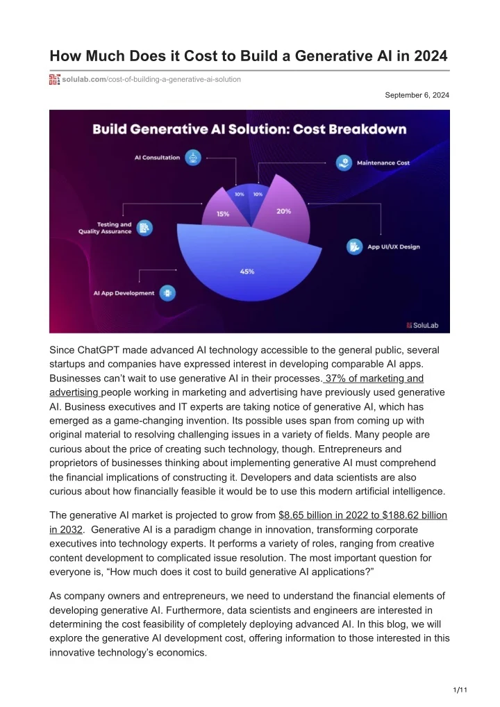 How Much Does it Cost to Build a Generative AI in 2024 solulab.com/cost-of-building-a-generative-ai-solution September 6, 2024 Since ChatGPT made advanced AI technology accessible to the general public, several startups and companies have expressed interest in developing comparable AI apps. Businesses can’t wait to use generative AI in their processes. 37% of marketing and advertising people working in marketing and advertising have previously used generative AI. Business executives and IT experts are taking notice of generative AI, which has emerged as a game-changing invention. Its possible uses span from coming up with original material to resolving challenging issues in a variety of fields. Many people are curious about the price of creating such technology, though. Entrepreneurs and proprietors of businesses thinking about implementing generative AI must comprehend the financial implications of constructing it. Developers and data scientists are also curious about how financially feasible it would be to use this modern artificial intelligence. The generative AI market is projected to grow from $8.65 billion in 2022 to $188.62 billion in 2032. Generative AI is a paradigm change in innovation, transforming corporate executives into technology experts. It performs a variety of roles, ranging from creative content development to complicated issue resolution. The most important question for everyone is, “How much does it cost to build generative AI applications?” As company owners and entrepreneurs, we need to understand the financial elements of developing generative AI. Furthermore, data scientists and engineers are interested in determining the cost feasibility of completely deploying advanced AI. In this blog, we will explore the generative AI development cost, offering information to those interested in this innovative technology’s economics. 1/11