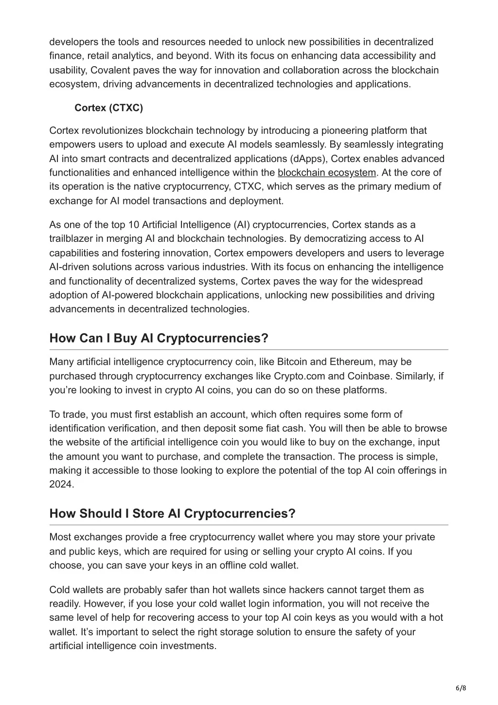 developers the tools and resources needed to unlock new possibilities in decentralized finance, retail analytics, and beyond. With its focus on enhancing data accessibility and usability, Covalent paves the way for innovation and collaboration across the blockchain ecosystem, driving advancements in decentralized technologies and applications. Cortex (CTXC) Cortex revolutionizes blockchain technology by introducing a pioneering platform that empowers users to upload and execute AI models seamlessly. By seamlessly integrating AI into smart contracts and decentralized applications (dApps), Cortex enables advanced functionalities and enhanced intelligence within the blockchain ecosystem. At the core of its operation is the native cryptocurrency, CTXC, which serves as the primary medium of exchange for AI model transactions and deployment. As one of the top 10 Artificial Intelligence (AI) cryptocurrencies, Cortex stands as a trailblazer in merging AI and blockchain technologies. By democratizing access to AI capabilities and fostering innovation, Cortex empowers developers and users to leverage AI-driven solutions across various industries. With its focus on enhancing the intelligence and functionality of decentralized systems, Cortex paves the way for the widespread adoption of AI-powered blockchain applications, unlocking new possibilities and driving advancements in decentralized technologies. How Can I Buy AI Cryptocurrencies? Many artificial intelligence cryptocurrency coin, like Bitcoin and Ethereum, may be purchased through cryptocurrency exchanges like Crypto.com and Coinbase. Similarly, if you’re looking to invest in crypto AI coins, you can do so on these platforms. To trade, you must first establish an account, which often requires some form of identification verification, and then deposit some fiat cash. You will then be able to browse the website of the artificial intelligence coin you would like to buy on the exchange, input the amount you want to purchase, and complete the transaction. The process is simple, making it accessible to those looking to explore the potential of the top AI coin offerings in 2024. How Should I Store AI Cryptocurrencies? Most exchanges provide a free cryptocurrency wallet where you may store your private and public keys, which are required for using or selling your crypto AI coins. If you choose, you can save your keys in an offline cold wallet. Cold wallets are probably safer than hot wallets since hackers cannot target them as readily. However, if you lose your cold wallet login information, you will not receive the same level of help for recovering access to your top AI coin keys as you would with a hot wallet. It’s important to select the right storage solution to ensure the safety of your artificial intelligence coin investments. 6/8
