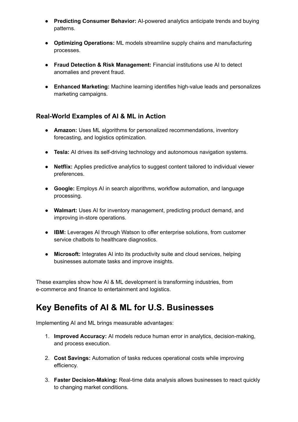 2. ● Predicting Consumer Behavior: AI-powered analytics anticipate trends and buying patterns. ● Optimizing Operations: ML models streamline supply chains and manufacturing processes. ● Fraud Detection & Risk Management: Financial institutions use AI to detect anomalies and prevent fraud. ● Enhanced Marketing: Machine learning identifies high-value leads and personalizes marketing campaigns. Real-World Examples of AI & ML in Action ● Amazon: Uses ML algorithms for personalized recommendations, inventory forecasting, and logistics optimization. ● Tesla: AI drives its self-driving technology and autonomous navigation systems. ● Netflix: Applies predictive analytics to suggest content tailored to individual viewer preferences. ● Google: Employs AI in search algorithms, workflow automation, and language processing. ● Walmart: Uses AI for inventory management, predicting product demand, and improving in-store operations. ● IBM: Leverages AI through Watson to offer enterprise solutions, from customer service chatbots to healthcare diagnostics. ● Microsoft: Integrates AI into its productivity suite and cloud services, helping businesses automate tasks and improve insights. These examples show how AI & ML development is transforming industries, from e-commerce and finance to entertainment and logistics. Key Benefits of AI & ML for U.S. Businesses Implementing AI and ML brings measurable advantages: 1. Improved Accuracy: AI models reduce human error in analytics, decision-making, and process execution. 2. Cost Savings: Automation of tasks reduces operational costs while improving efficiency. 3. Faster Decision-Making: Real-time data analysis allows businesses to react quickly to changing market conditions.