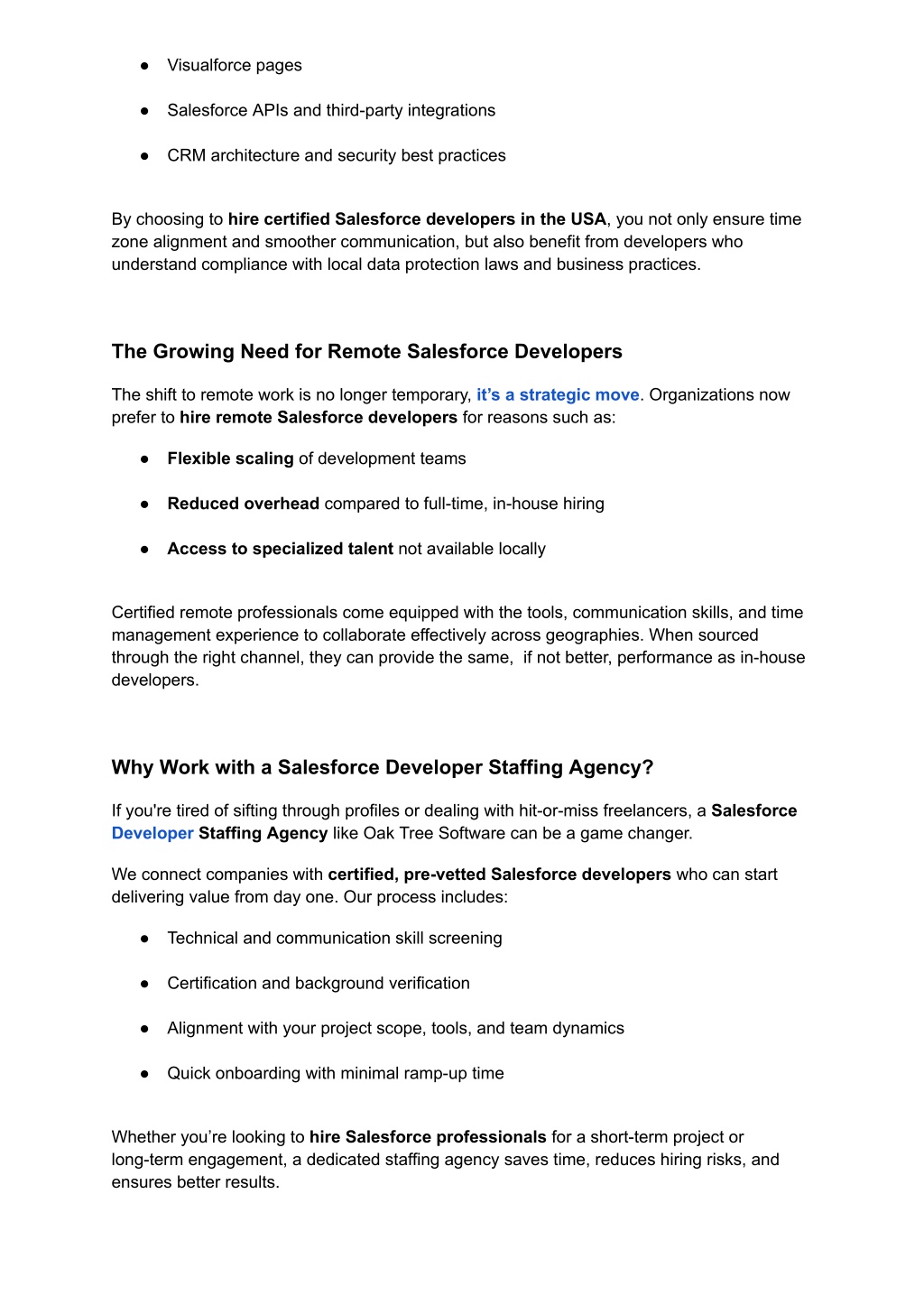 ● Visualforce pages ● Salesforce APIs and third-party integrations ● CRM architecture and security best practices By choosing to hire certified Salesforce developers in the USA, you not only ensure time zone alignment and smoother communication, but also benefit from developers who understand compliance with local data protection laws and business practices. The Growing Need for Remote Salesforce Developers The shift to remote work is no longer temporary, it’s a strategic move. Organizations now prefer to hire remote Salesforce developers for reasons such as: ● Flexible scaling of development teams ● Reduced overhead compared to full-time, in-house hiring ● Access to specialized talent not available locally Certified remote professionals come equipped with the tools, communication skills, and time management experience to collaborate effectively across geographies. When sourced through the right channel, they can provide the same, if not better, performance as in-house developers. Why Work with a Salesforce Developer Staffing Agency? If you're tired of sifting through profiles or dealing with hit-or-miss freelancers, a Salesforce Developer Staffing Agency like Oak Tree Software can be a game changer. We connect companies with certified, pre-vetted Salesforce developers who can start delivering value from day one. Our process includes: ● Technical and communication skill screening ● Certification and background verification ● Alignment with your project scope, tools, and team dynamics ● Quick onboarding with minimal ramp-up time Whether you’re looking to hire Salesforce professionals for a short-term project or long-term engagement, a dedicated staffing agency saves time, reduces hiring risks, and ensures better results.