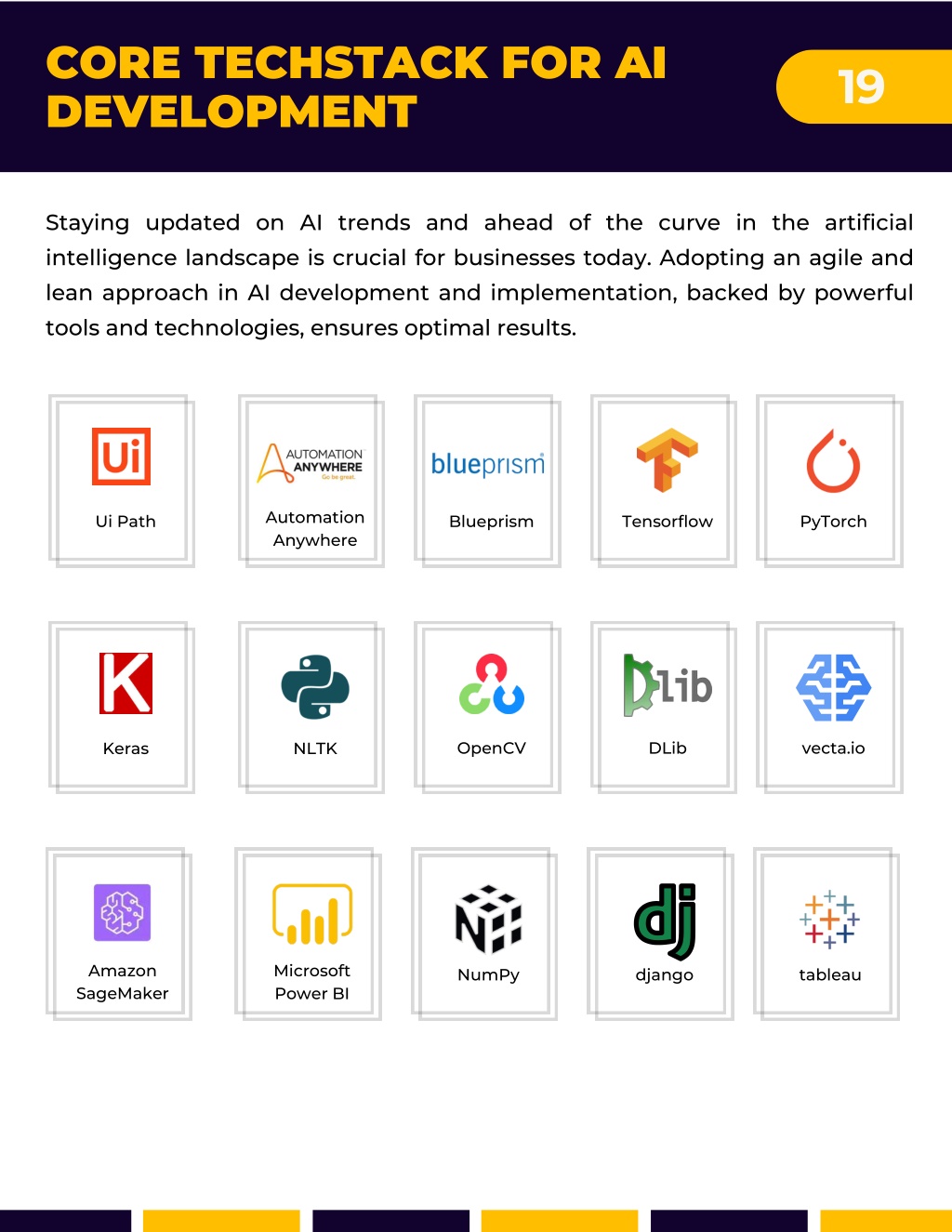 CORE TECHSTACK FOR AI DEVELOPMENT 19 Staying updated on AI trends and ahead of the curve in the artificial intelligence landscape is crucial for businesses today. Adopting an agile and lean approach in AI development and implementation, backed by powerful tools and technologies, ensures optimal results. Automation Anywhere Ui Path Blueprism Tensorflow PyTorch OpenCV DLib vecta.io Keras NLTK Amazon SageMaker Microsoft Power BI NumPy django tableau
