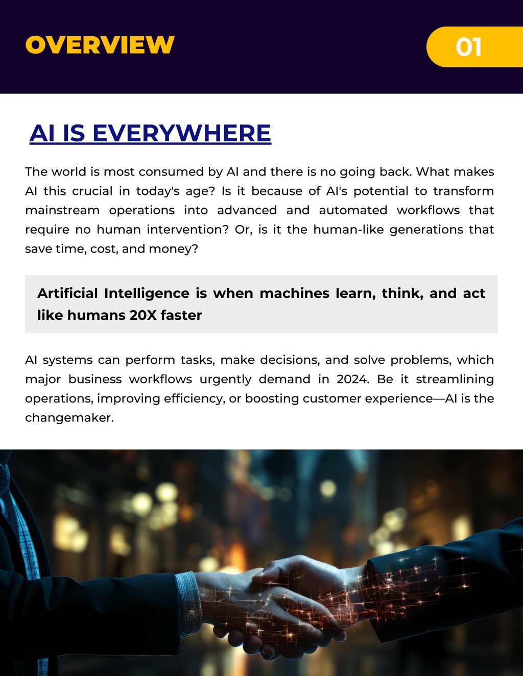 OVERVIEW 01 AI IS EVERYWHERE The world is most consumed by AI and there is no going back. What makes AI this crucial in today's age? Is it because of AI's potential to transform mainstream operations into advanced and automated workflows that require no human intervention? Or, is it the human-like generations that save time, cost, and money? Artificial Intelligence is when machines learn, think, and act like humans 20X faster AI systems can perform tasks, make decisions, and solve problems, which major business workflows urgently demand in 2024. Be it streamlining operations, improving efficiency, or boosting customer experience—AI is the changemaker.