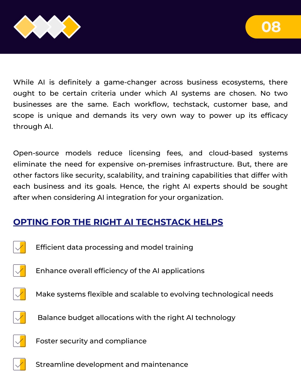 08 While AI is definitely a game-changer across business ecosystems, there ought to be certain criteria under which AI systems are chosen. No two businesses are the same. Each workflow, techstack, customer base, and scope is unique and demands its very own way to power up its efficacy through AI. Open-source models reduce licensing fees, and cloud-based systems eliminate the need for expensive on-premises infrastructure. But, there are other factors like security, scalability, and training capabilities that differ with each business and its goals. Hence, the right AI experts should be sought after when considering AI integration for your organization. OPTING FOR THE RIGHT AI TECHSTACK HELPS Efficient data processing and model training Enhance overall efficiency of the AI applications Make systems flexible and scalable to evolving technological needs Balance budget allocations with the right AI technology Foster security and compliance Streamline development and maintenance