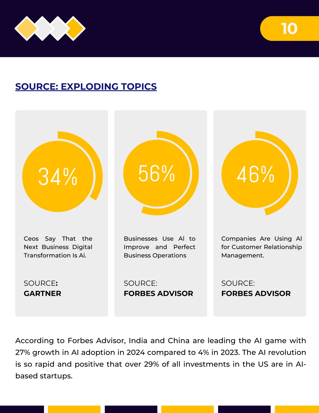10 SOURCE: EXPLODING TOPICS Ceos Say That the Next Business Digital Transformation Is Ai. Businesses Use Al to Improve and Perfect Business Operations Companies Are Using Al for Customer Relationship Management. SOURCE: GARTNER SOURCE: FORBES ADVISOR SOURCE: FORBES ADVISOR According to Forbes Advisor, India and China are leading the AI game with 27% growth in AI adoption in 2024 compared to 4% in 2023. The AI revolution is so rapid and positive that over 29% of all investments in the US are in AI- based startups.
