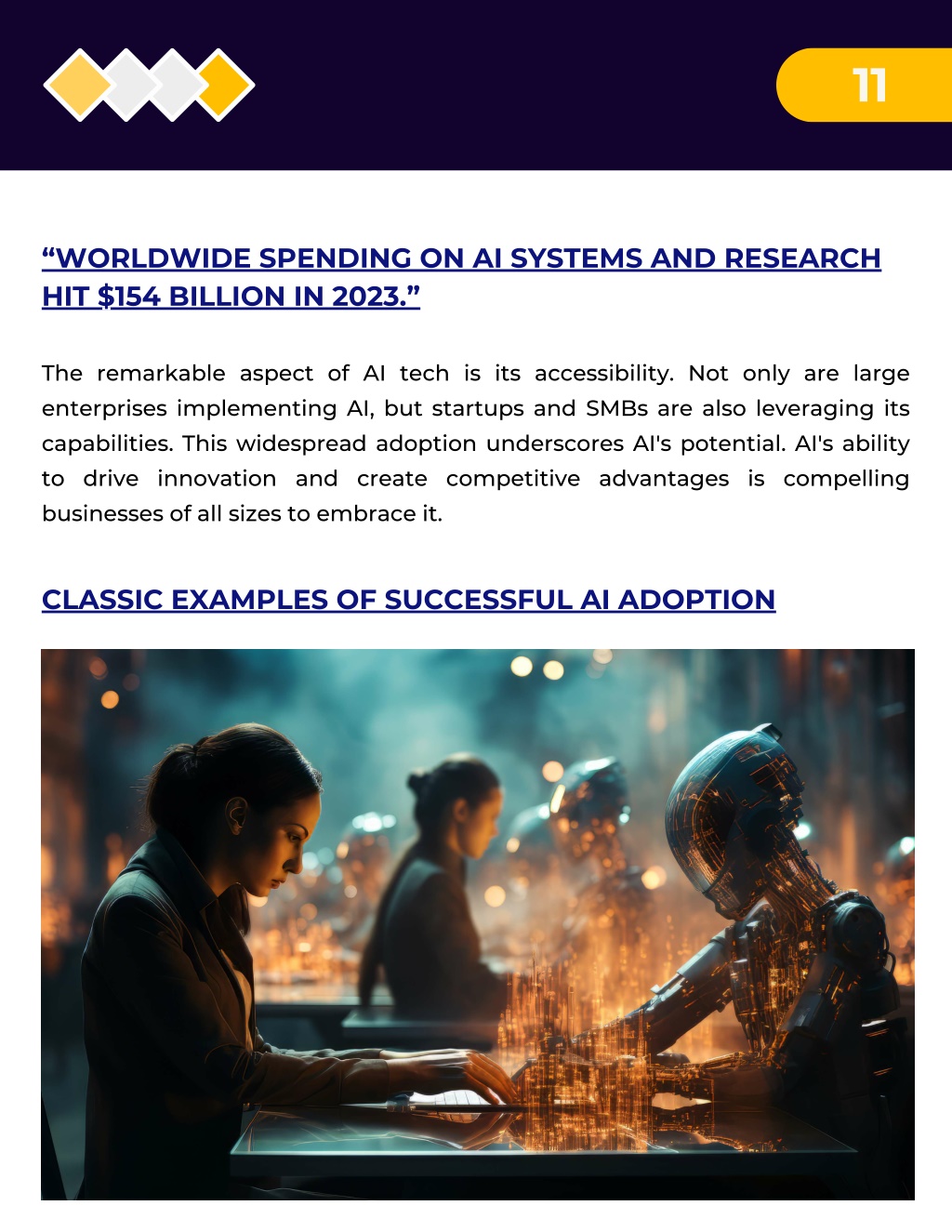 11 “WORLDWIDE SPENDING ON AI SYSTEMS AND RESEARCH HIT $154 BILLION IN 2023.” The remarkable aspect of AI tech is its accessibility. Not only are large enterprises implementing AI, but startups and SMBs are also leveraging its capabilities. This widespread adoption underscores AI's potential. AI's ability to drive innovation and create competitive advantages is compelling businesses of all sizes to embrace it. CLASSIC EXAMPLES OF SUCCESSFUL AI ADOPTION