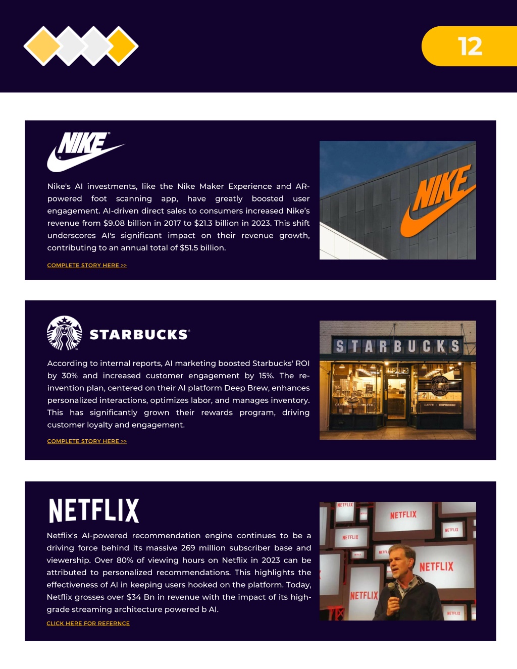 12 Nike's AI investments, like the Nike Maker Experience and AR- powered foot scanning app, engagement. AI-driven direct sales to consumers increased Nike’s revenue from $9.08 billion in 2017 to $21.3 billion in 2023. This shift underscores AI's significant impact on their revenue growth, contributing to an annual total of $51.5 billion. have greatly boosted user COMPLETE STORY HERE >> According to internal reports, AI marketing boosted Starbucks' ROI by 30% and increased customer engagement by 15%. The re- invention plan, centered on their AI platform Deep Brew, enhances personalized interactions, optimizes labor, and manages inventory. This has significantly grown their rewards program, driving customer loyalty and engagement. COMPLETE STORY HERE >> Netflix's AI-powered recommendation engine continues to be a driving force behind its massive 269 million subscriber base and viewership. Over 80% of viewing hours on Netflix in 2023 can be attributed to personalized recommendations. This highlights the effectiveness of AI in keeping users hooked on the platform. Today, Netflix grosses over $34 Bn in revenue with the impact of its high- grade streaming architecture powered b AI. CLICK HERE FOR REFERNCE