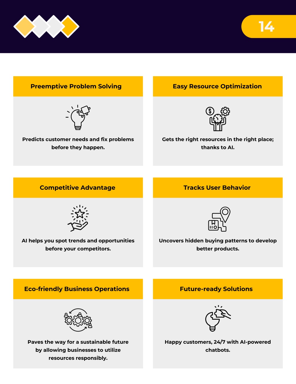 14 Preemptive Problem Solving Easy Resource Optimization Predicts customer needs and fix problems before they happen. Gets the right resources in the right place; thanks to AI. Competitive Advantage Tracks User Behavior AI helps you spot trends and opportunities before your competitors. Uncovers hidden buying patterns to develop better products. Eco-friendly Business Operations Future-ready Solutions Paves the way for a sustainable future by allowing businesses to utilize resources responsibly. Happy customers, 24/7 with AI-powered chatbots.