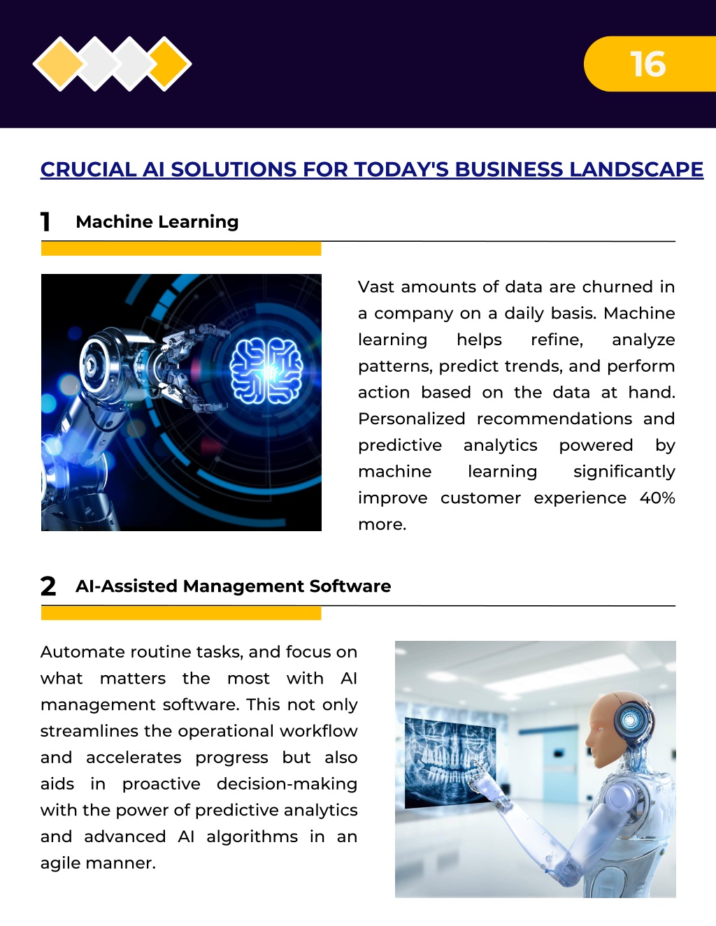 16 CRUCIAL AI SOLUTIONS FOR TODAY'S BUSINESS LANDSCAPE 1 Machine Learning Vast amounts of data are churned in a company on a daily basis. Machine learning helps patterns, predict trends, and perform action based on the data at hand. Personalized recommendations and predictive analytics machine learning improve customer experience 40% more. refine, analyze powered significantly by 2 AI-Assisted Management Software Automate routine tasks, and focus on what matters the most with AI management software. This not only streamlines the operational workflow and accelerates progress but also aids in proactive decision-making with the power of predictive analytics and advanced AI algorithms in an agile manner.