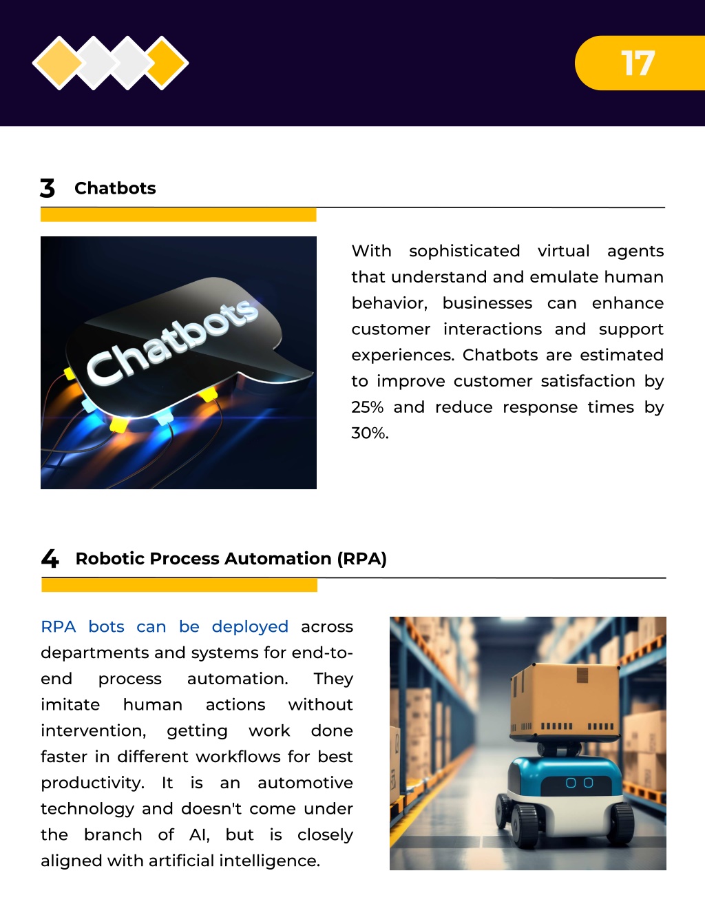 17 3 Chatbots With sophisticated virtual agents that understand and emulate human behavior, businesses can enhance customer interactions and support experiences. Chatbots are estimated to improve customer satisfaction by 25% and reduce response times by 30%. 4 Robotic Process Automation (RPA) RPA bots can be deployed across departments and systems for end-to- end process automation. imitate human intervention, getting faster in different workflows for best productivity. It is an automotive technology and doesn't come under the branch of AI, but is closely aligned with artificial intelligence. They actions without done work