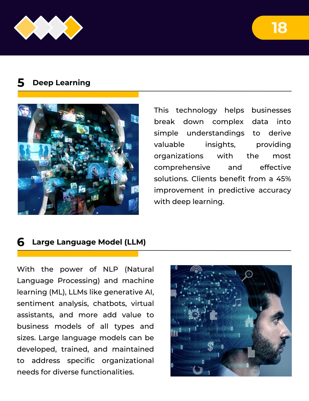 18 5 Deep Learning This technology helps businesses break down complex simple understandings to derive valuable insights, organizations with comprehensive solutions. Clients benefit from a 45% improvement in predictive accuracy with deep learning. data into providing the effective most and 6 Large Language Model (LLM) With the power of NLP (Natural Language Processing) and machine learning (ML), LLMs like generative AI, sentiment analysis, chatbots, virtual assistants, and more add value to business models of all types and sizes. Large language models can be developed, trained, and maintained to address specific organizational needs for diverse functionalities.