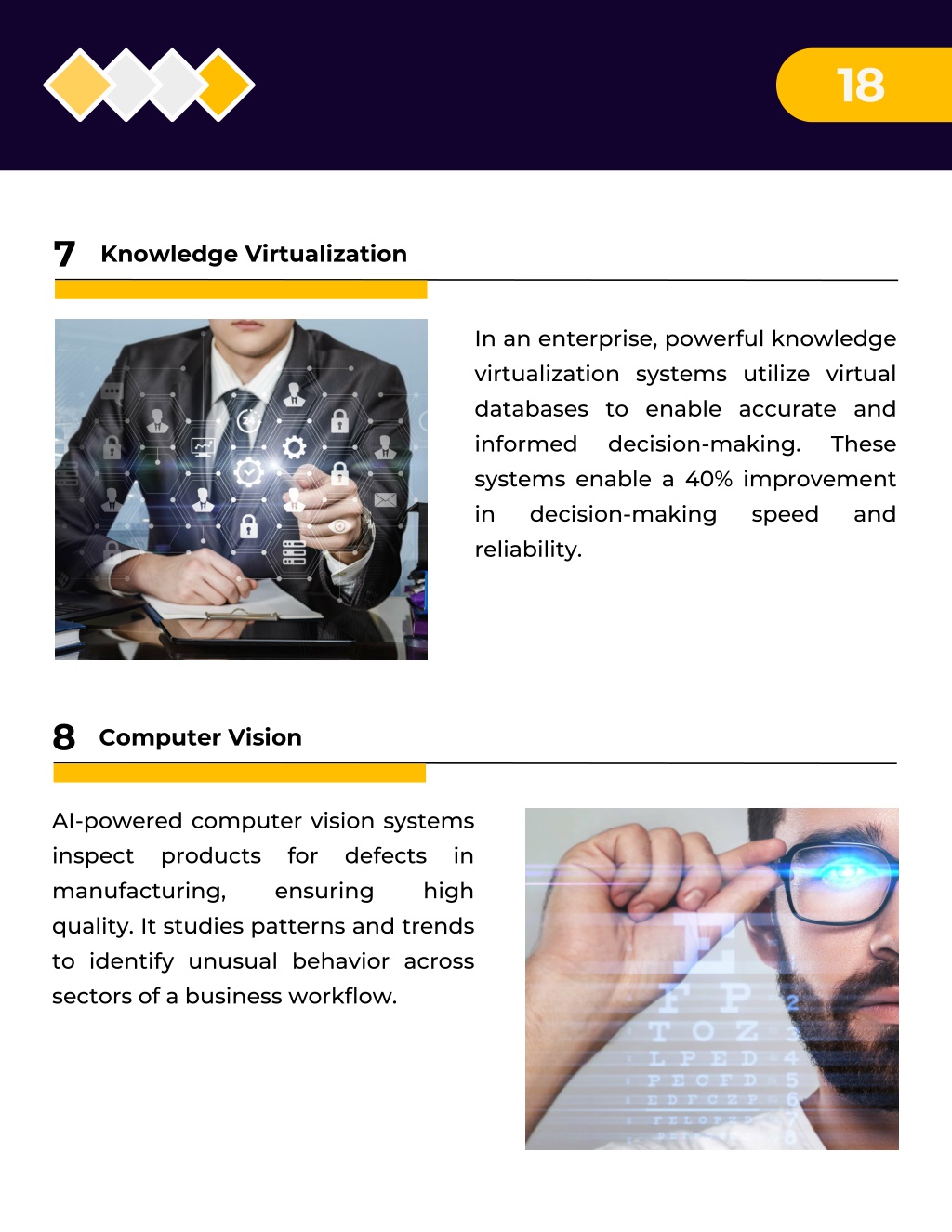 18 7 Knowledge Virtualization In an enterprise, powerful knowledge virtualization systems utilize virtual databases to enable accurate and informed decision-making. systems enable a 40% improvement in decision-making reliability. These speed and 8 Computer Vision AI-powered computer vision systems inspect products manufacturing, quality. It studies patterns and trends to identify unusual behavior across sectors of a business workflow. for ensuring defects in high