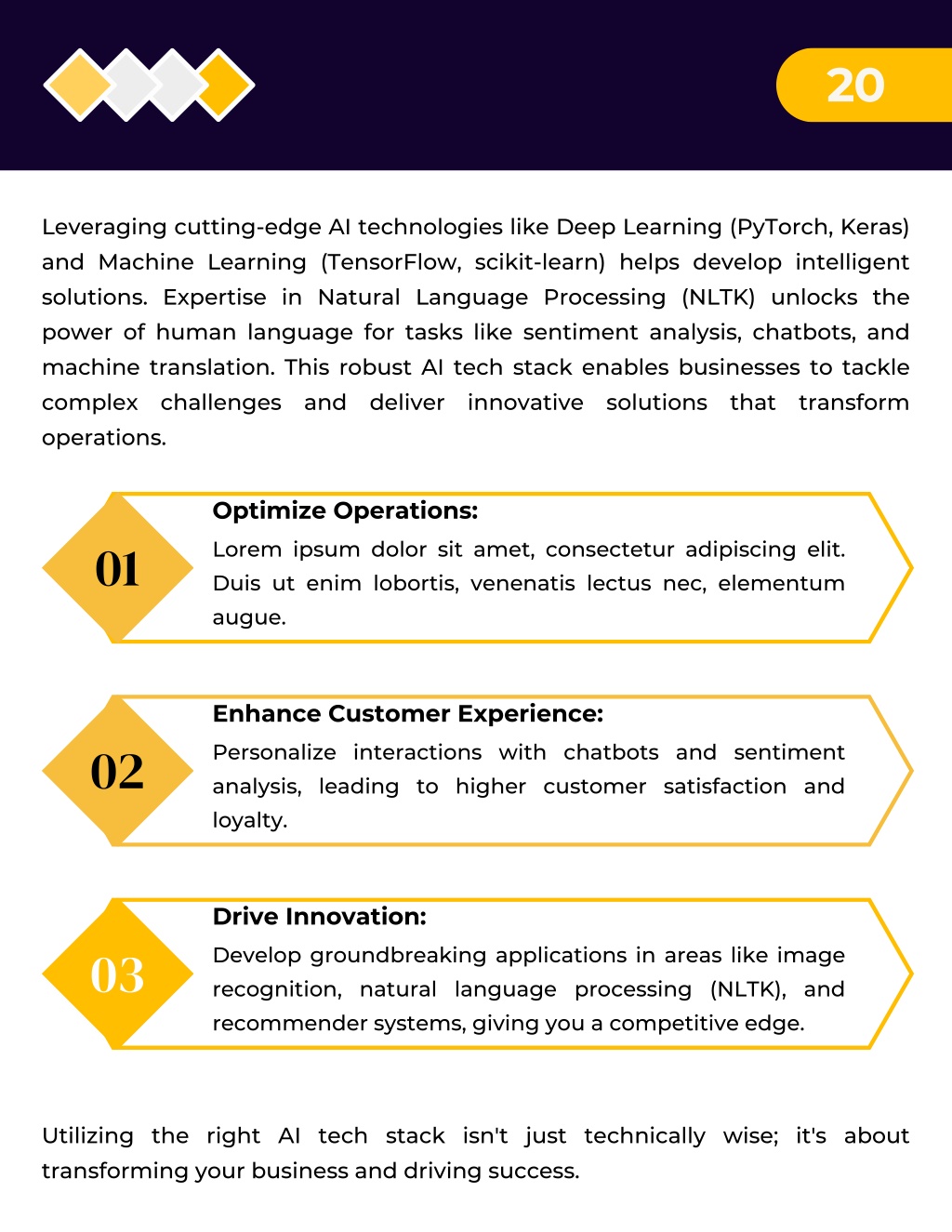 20 Leveraging cutting-edge AI technologies like Deep Learning (PyTorch, Keras) and Machine Learning (TensorFlow, scikit-learn) helps develop intelligent solutions. Expertise in Natural Language Processing (NLTK) unlocks the power of human language for tasks like sentiment analysis, chatbots, and machine translation. This robust AI tech stack enables businesses to tackle complex challenges and deliver innovative solutions that transform operations. Optimize Operations: 01 Lorem ipsum dolor sit amet, consectetur adipiscing elit. Duis ut enim lobortis, venenatis lectus nec, elementum augue. Enhance Customer Experience: 02 Personalize interactions with chatbots and sentiment analysis, leading to higher customer satisfaction and loyalty. Drive Innovation: 03 Develop groundbreaking applications in areas like image recognition, natural language processing (NLTK), and recommender systems, giving you a competitive edge. Utilizing the right AI tech stack isn't just technically wise; it's about transforming your business and driving success.