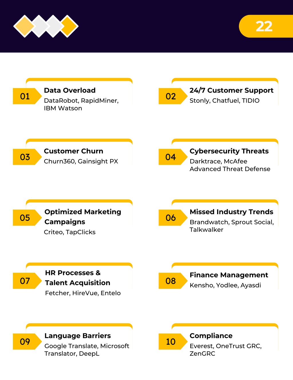 MODERN AI TOOLS THAT RESOLVE COMMON BUSINESS CHALLENGES 21 The capabilities of AI are immense. Businesses globally have realized how fruitful AI innovations are in resolving business challenges. The volatility of AI to fit into any use case or business scenario helps organizations to adopt and custom-include AI technologies into their conventional processes. AI helps businesses expand their horizons and try out new solutions to old problems. Companies have started trying out-of-the-box strategies and workflows that enhance the essence of business operations and customer experience. HERE’S A LOOK INTO COMMON BUSINESS CHALLENGES THAT AI RESOLVE: