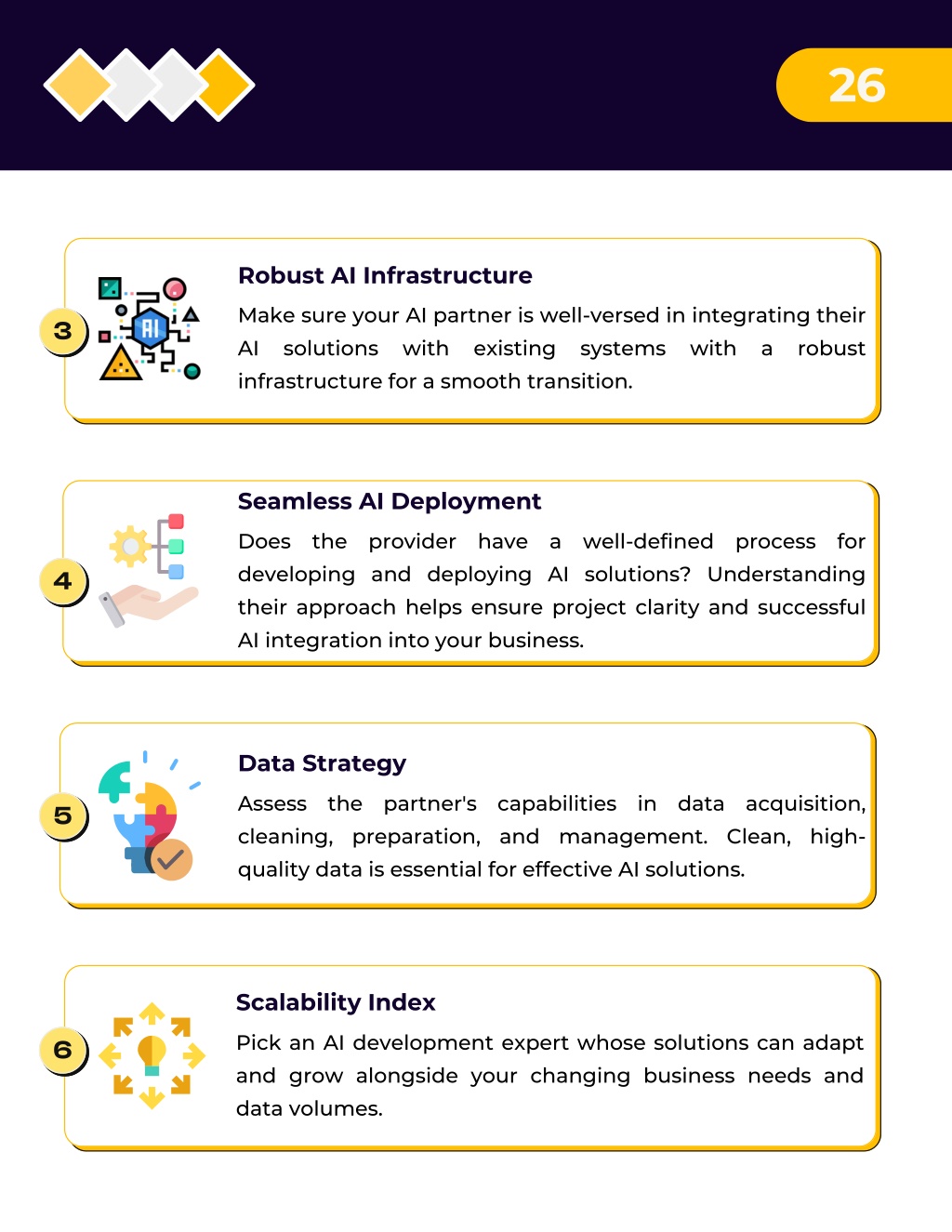 26 Robust AI Infrastructure Make sure your AI partner is well-versed in integrating their AI solutions with existing systems with a robust infrastructure for a smooth transition. 3 Seamless AI Deployment Does the provider have a well-defined process for developing and deploying AI solutions? Understanding their approach helps ensure project clarity and successful AI integration into your business. 4 Data Strategy Assess the partner's capabilities in data acquisition, cleaning, preparation, and management. Clean, high- quality data is essential for effective AI solutions. 5 Scalability Index Pick an AI development expert whose solutions can adapt and grow alongside your changing business needs and data volumes. 6