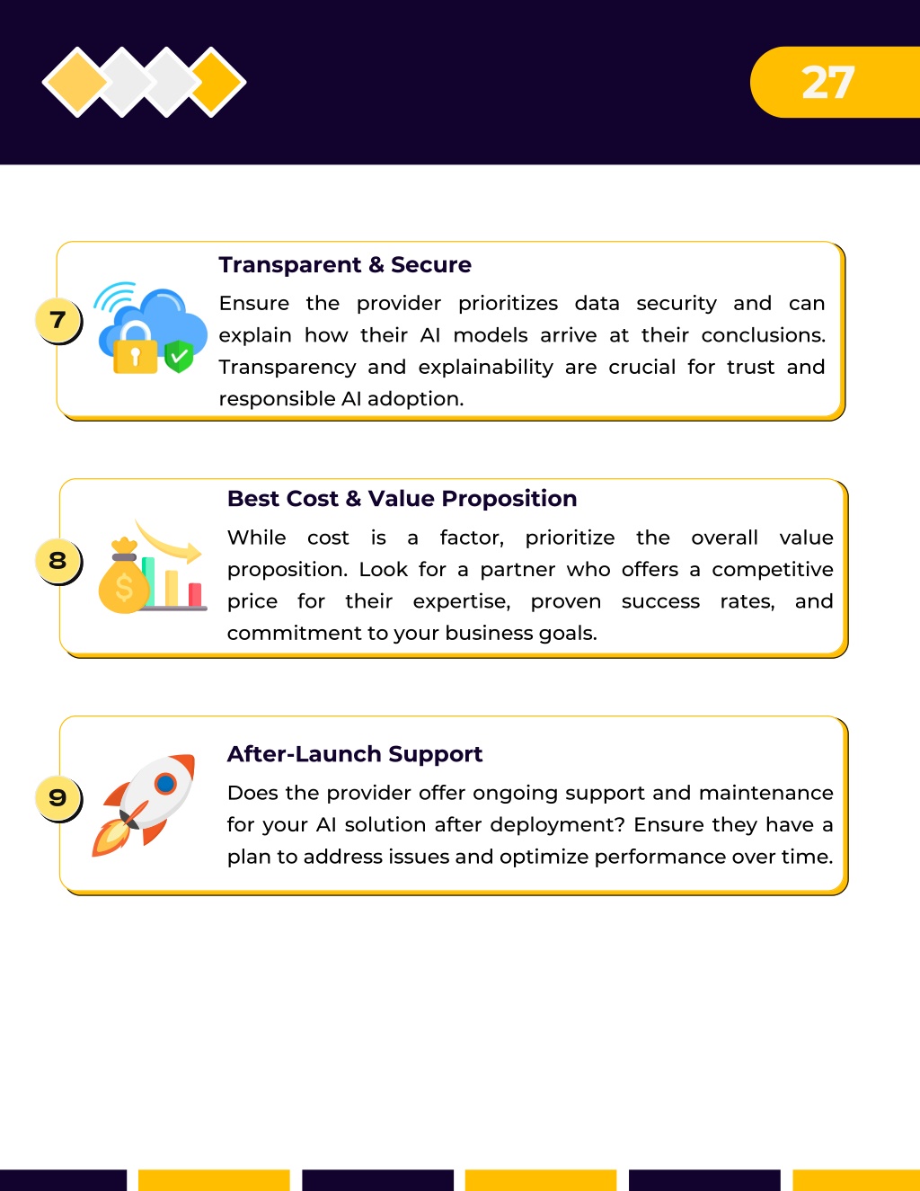 27 Transparent & Secure Ensure the provider prioritizes data security and can explain how their AI models arrive at their conclusions. Transparency and explainability are crucial for trust and responsible AI adoption. 7 Best Cost & Value Proposition While cost is a factor, prioritize the overall value proposition. Look for a partner who offers a competitive price for their expertise, proven success rates, and commitment to your business goals. 8 After-Launch Support Does the provider offer ongoing support and maintenance for your AI solution after deployment? Ensure they have a plan to address issues and optimize performance over time. 9