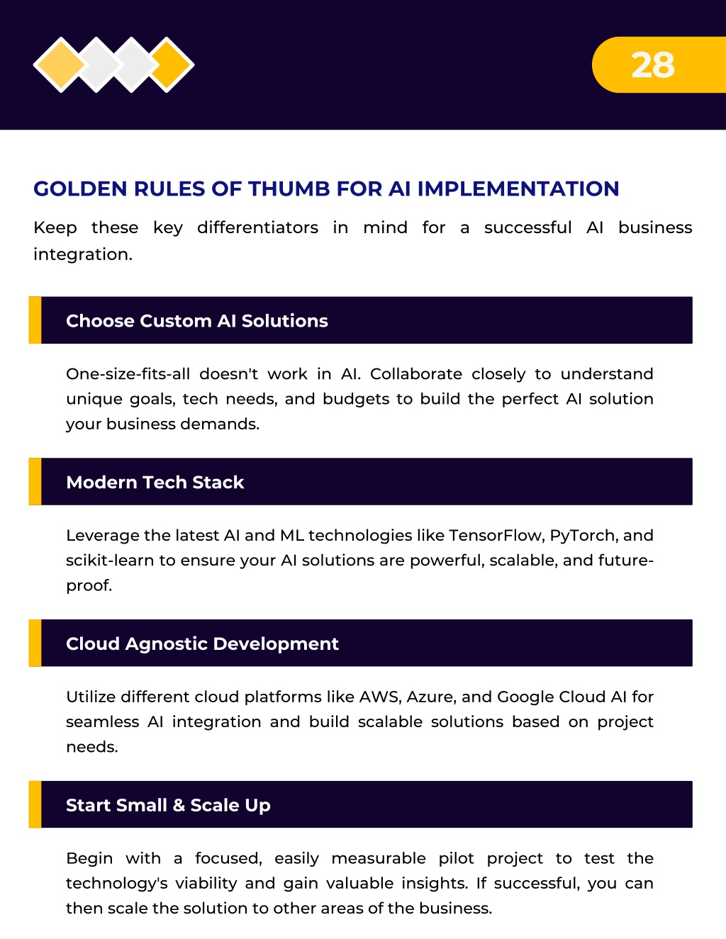 28 GOLDEN RULES OF THUMB FOR AI IMPLEMENTATION Keep these key differentiators in mind for a successful AI business integration. Choose Custom AI Solutions One-size-fits-all doesn't work in AI. Collaborate closely to understand unique goals, tech needs, and budgets to build the perfect AI solution your business demands. Modern Tech Stack Leverage the latest AI and ML technologies like TensorFlow, PyTorch, and scikit-learn to ensure your AI solutions are powerful, scalable, and future- proof. Cloud Agnostic Development Utilize different cloud platforms like AWS, Azure, and Google Cloud AI for seamless AI integration and build scalable solutions based on project needs. Start Small & Scale Up Begin with a focused, easily measurable pilot project to test the technology's viability and gain valuable insights. If successful, you can then scale the solution to other areas of the business.