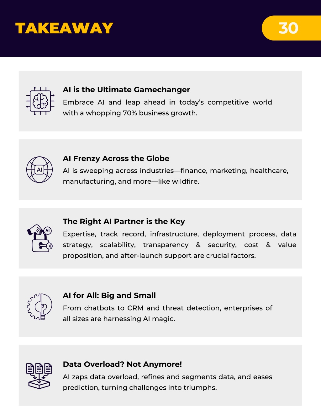 30 TAKEAWAY AI is the Ultimate Gamechanger Embrace AI and leap ahead in today’s competitive world with a whopping 70% business growth. AI Frenzy Across the Globe AI is sweeping across industries—finance, marketing, healthcare, manufacturing, and more—like wildfire. The Right AI Partner is the Key Expertise, track record, infrastructure, deployment process, data strategy, scalability, transparency & security, cost & value proposition, and after-launch support are crucial factors. AI for All: Big and Small From chatbots to CRM and threat detection, enterprises of all sizes are harnessing AI magic. Data Overload? Not Anymore! AI zaps data overload, refines and segments data, and eases prediction, turning challenges into triumphs.