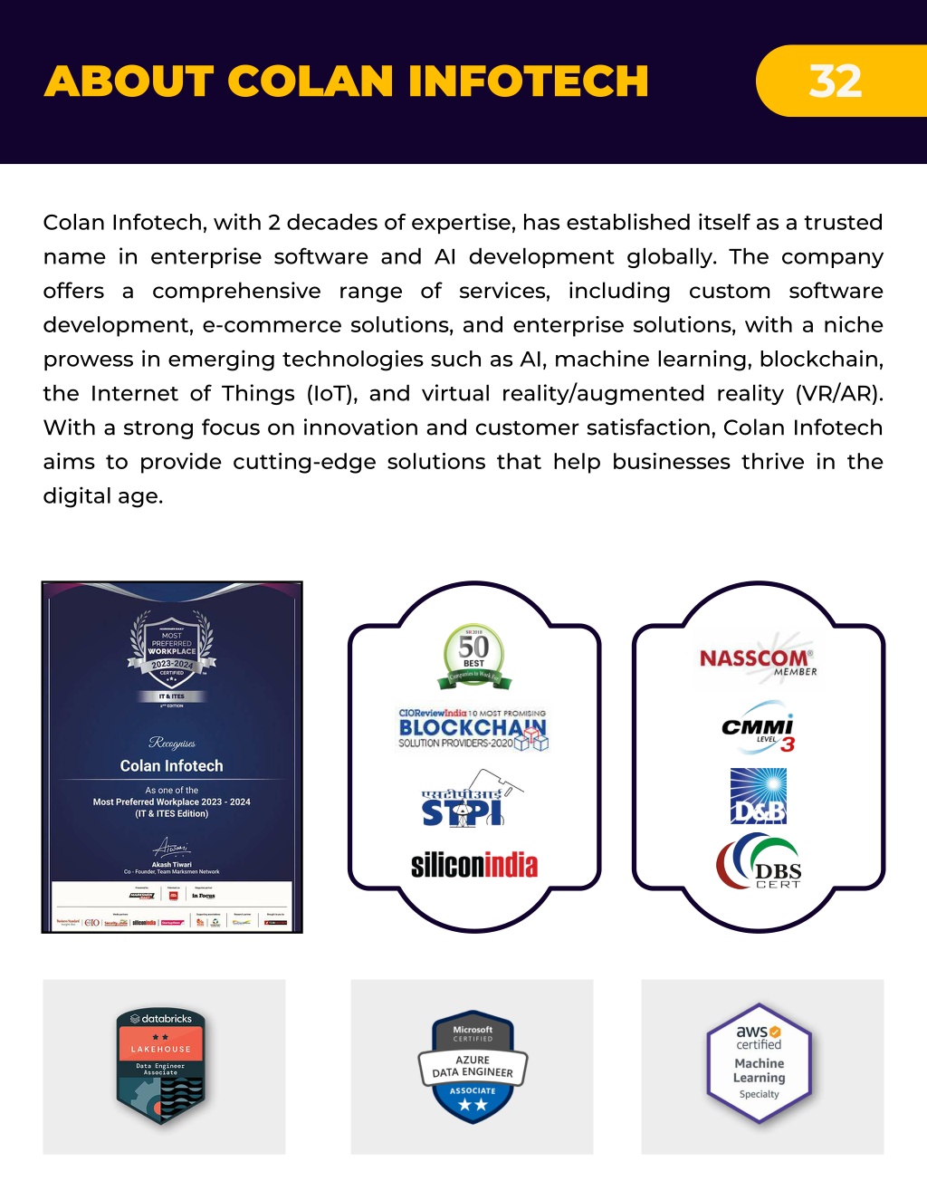 32 ABOUT COLAN INFOTECH Colan Infotech, with 2 decades of expertise, has established itself as a trusted name in enterprise software and AI development globally. The company offers a comprehensive range of services, including custom software development, e-commerce solutions, and enterprise solutions, with a niche prowess in emerging technologies such as AI, machine learning, blockchain, the Internet of Things (IoT), and virtual reality/augmented reality (VR/AR). With a strong focus on innovation and customer satisfaction, Colan Infotech aims to provide cutting-edge solutions that help businesses thrive in the digital age.