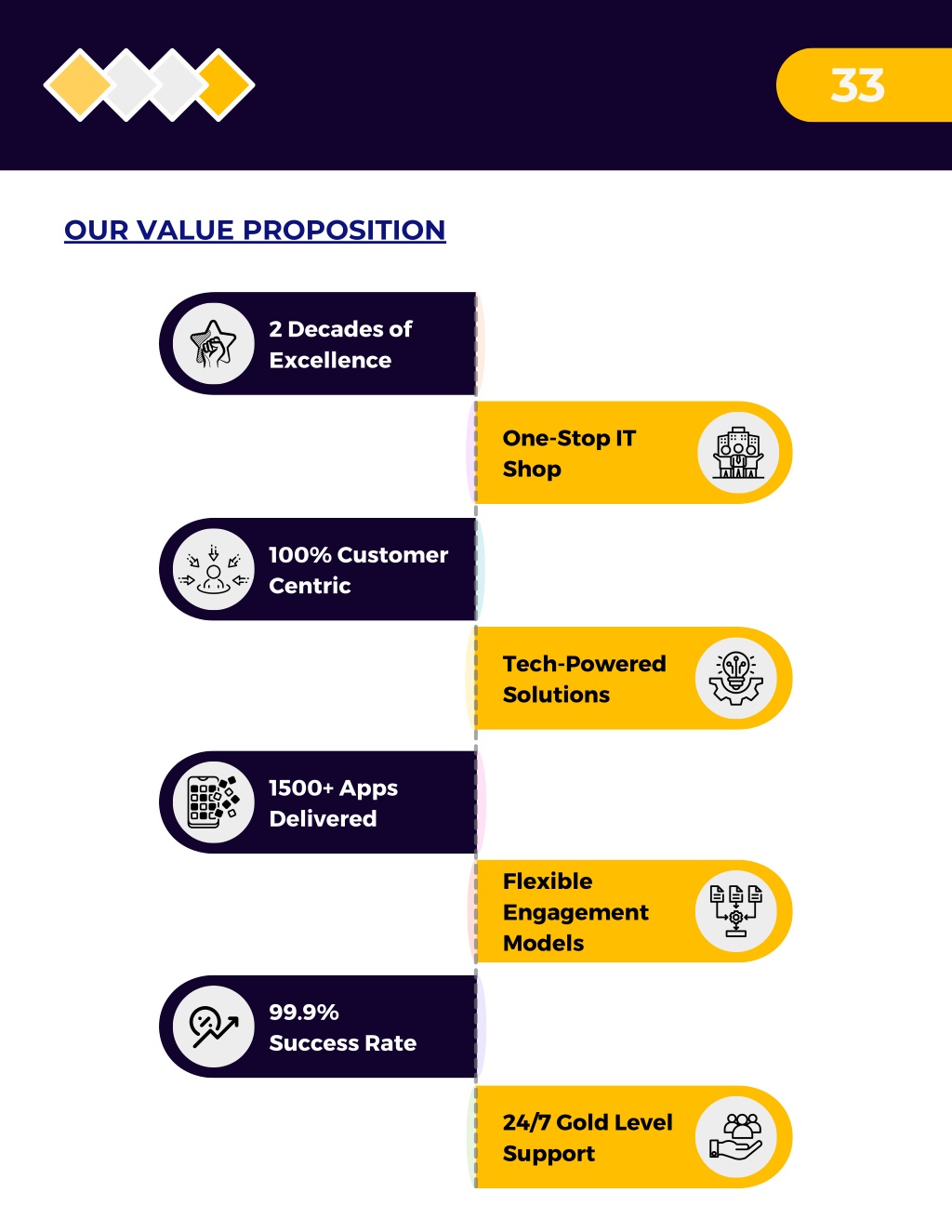33 OUR VALUE PROPOSITION 2 Decades of Excellence One-Stop IT Shop 100% Customer Centric Tech-Powered Solutions 1500+ Apps Delivered Flexible Engagement Models 99.9% Success Rate 24/7 Gold Level Support
