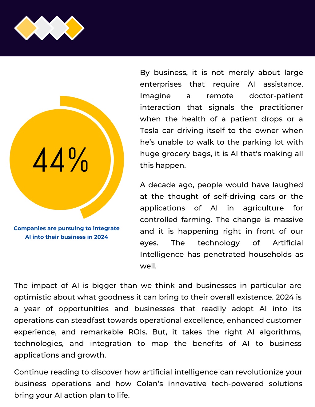 02 By business, it is not merely about large enterprises that require AI assistance. Imagine a remote interaction that signals the practitioner when the health of a patient drops or a Tesla car driving itself to the owner when he’s unable to walk to the parking lot with huge grocery bags, it is AI that’s making all this happen. doctor-patient A decade ago, people would have laughed at the thought of self-driving cars or the applications of AI controlled farming. The change is massive and it is happening right in front of our eyes. The technology Intelligence has penetrated households as well. in agriculture for Companies are pursuing to integrate Al into their business in 2024 of Artificial The impact of AI is bigger than we think and businesses in particular are optimistic about what goodness it can bring to their overall existence. 2024 is a year of opportunities and businesses that readily adopt AI into its operations can steadfast towards operational excellence, enhanced customer experience, and remarkable ROIs. But, it takes the right AI algorithms, technologies, and integration to map the benefits of AI to business applications and growth. Continue reading to discover how artificial intelligence can revolutionize your business operations and how Colan’s innovative tech-powered solutions bring your AI action plan to life.