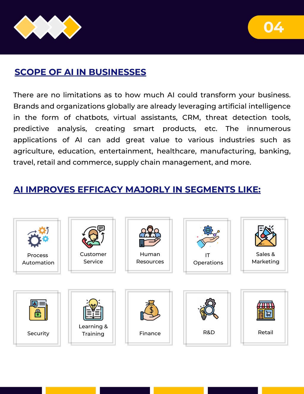 04 SCOPE OF AI IN BUSINESSES There are no limitations as to how much AI could transform your business. Brands and organizations globally are already leveraging artificial intelligence in the form of chatbots, virtual assistants, CRM, threat detection tools, predictive analysis, creating smart applications of AI can add great value to various industries such as agriculture, education, entertainment, healthcare, manufacturing, banking, travel, retail and commerce, supply chain management, and more. products, etc. The innumerous AI IMPROVES EFFICACY MAJORLY IN SEGMENTS LIKE: Customer Service Human Resources Sales & Marketing Process Automation IT Operations Learning & Training R&D Retail Security Finance
