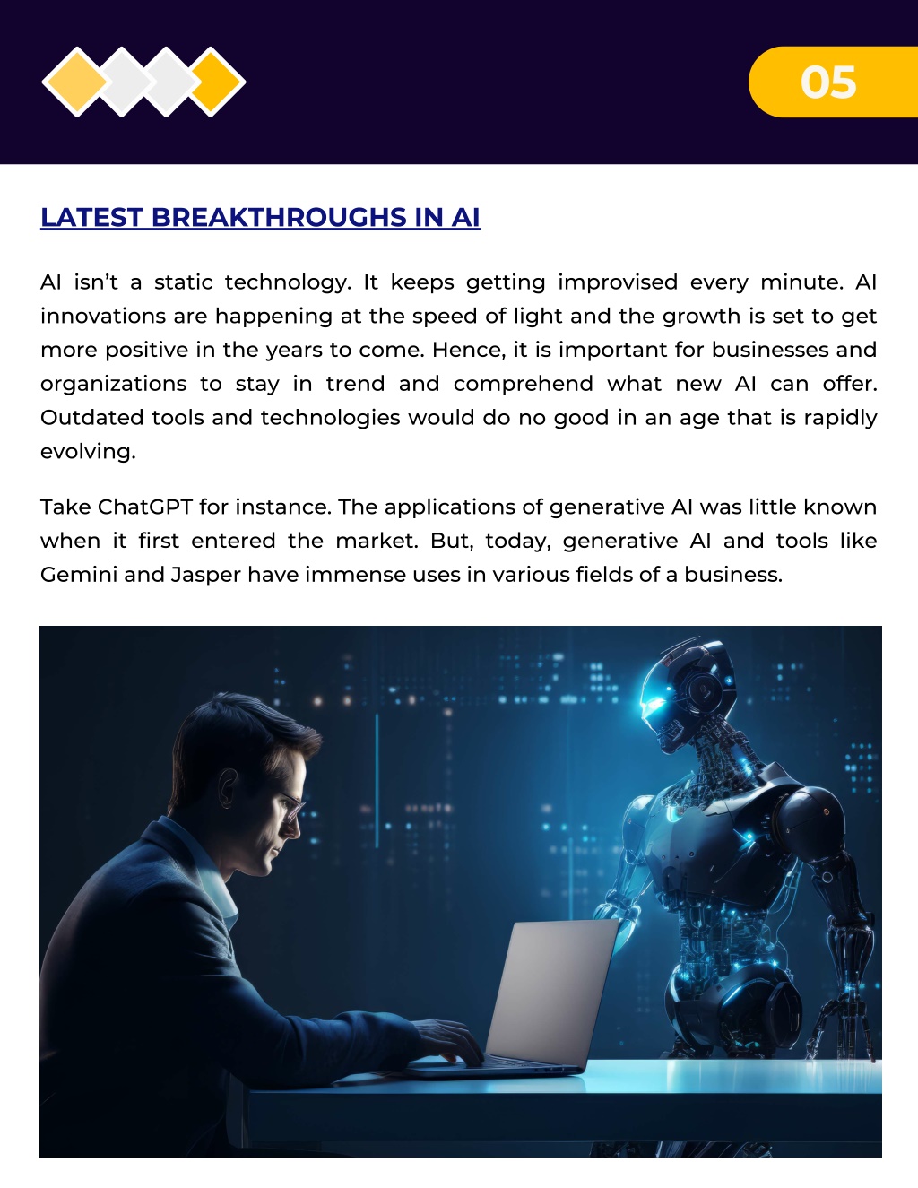 05 LATEST BREAKTHROUGHS IN AI AI isn’t a static technology. It keeps getting improvised every minute. AI innovations are happening at the speed of light and the growth is set to get more positive in the years to come. Hence, it is important for businesses and organizations to stay in trend and comprehend what new AI can offer. Outdated tools and technologies would do no good in an age that is rapidly evolving. Take ChatGPT for instance. The applications of generative AI was little known when it first entered the market. But, today, generative AI and tools like Gemini and Jasper have immense uses in various fields of a business.