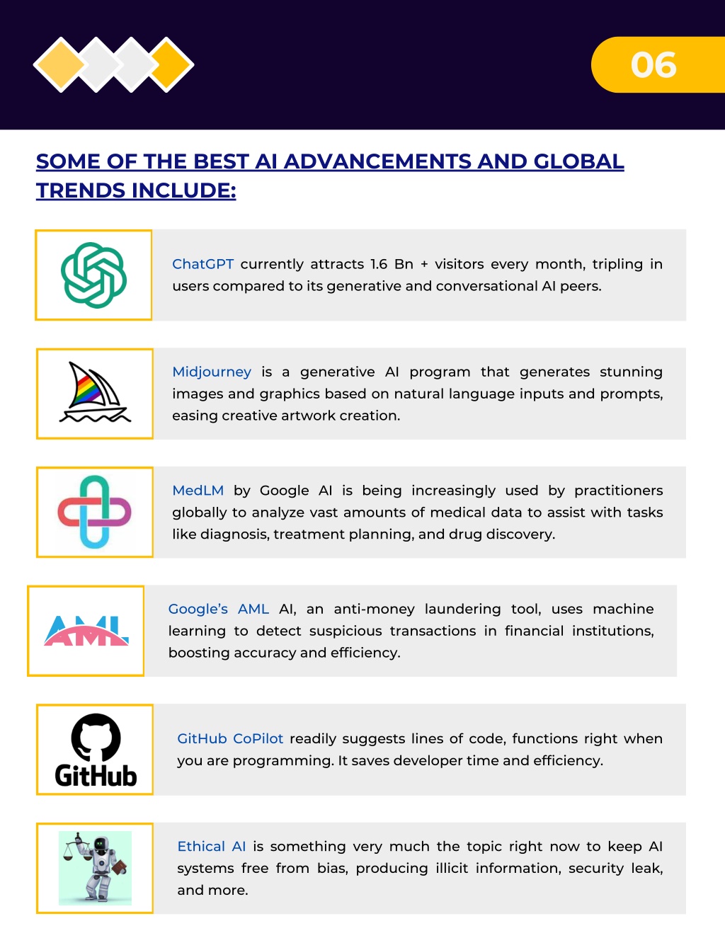 06 SOME OF THE BEST AI ADVANCEMENTS AND GLOBAL TRENDS INCLUDE: ChatGPT currently attracts 1.6 Bn + visitors every month, tripling in users compared to its generative and conversational AI peers. Midjourney is a generative AI program that generates stunning images and graphics based on natural language inputs and prompts, easing creative artwork creation. MedLM by Google AI is being increasingly used by practitioners globally to analyze vast amounts of medical data to assist with tasks like diagnosis, treatment planning, and drug discovery. Google’s AML AI, an anti-money laundering tool, uses machine learning to detect suspicious transactions in financial institutions, boosting accuracy and efficiency. GitHub CoPilot readily suggests lines of code, functions right when you are programming. It saves developer time and efficiency. Ethical AI is something very much the topic right now to keep AI systems free from bias, producing illicit information, security leak, and more.